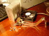 <br/><br/>Спал неважно. встал рано Уже в 0400 утра разглядывал "врага" в лицо (Igloo 7200 Light). Зажим выполнен на отлично с одним "но", как видно на фото системника у меня установлено пассивное охлаждение чипсета в виде радиатора от кулера на проц К7 =) (прикрепил оч просто 2 дырки соответсвенно стандартным размерам в основании и родные пластиковые штыри встали как надо) и рычаг теперь в него упирается установка стала затруднительной. На поверку основание радиатора оказалось не квадратным, а 66х78 мм что немного неукладывается в "проэктную конструкцию". насчитал 30 ребёр + 2 боковых толстых на которые крепим вентилятор.