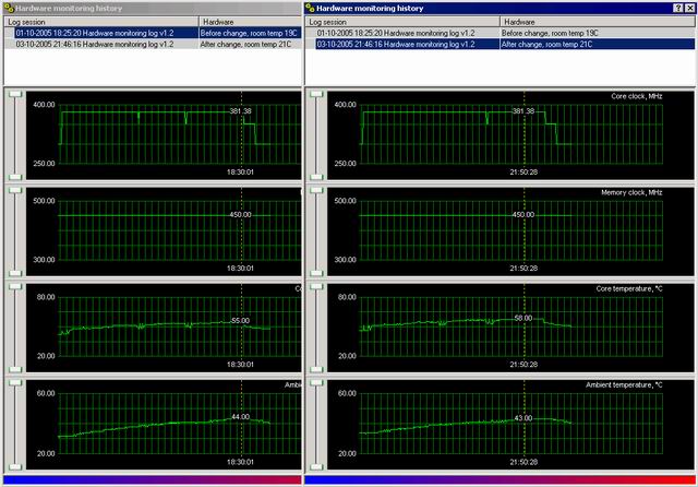 До замены температура в комнате была 19 градусов, после замены 21 градус (замерял обычным комнатным термометром). Драйвер после замены выдал меньшие частоты, что и не удивительно, принимаю во внимание возросшую на 2 градуса температуру в комнате.