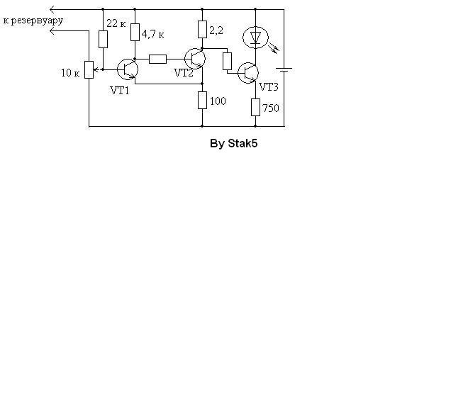 и спешу поделиться с Вами. Если в резервуаре уровень(тосола,или ещё чего) опуститься ниже заданного нами уровня(на котором будут установлены две пластиночки) то загорится красный сверхъяркий светодиод(возможно ещё сделать так чтобы при нормальном уровне содержимого всегда горел зелёный светодиод….и сделать это всё в виде панельки в отсек 3 дюймовый, или в виде заглушки PCI. Вот схема, транзисторы пока не написал, а то «плохие люди» возьмут и стырят идею.Можно конечно ещё и звуковую сигнализацию сделать но не знаю есть ли смысл?