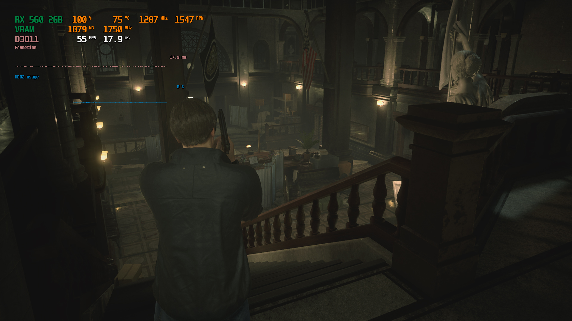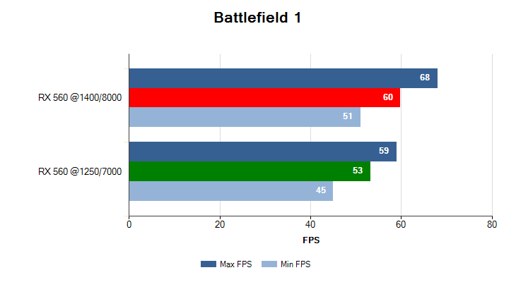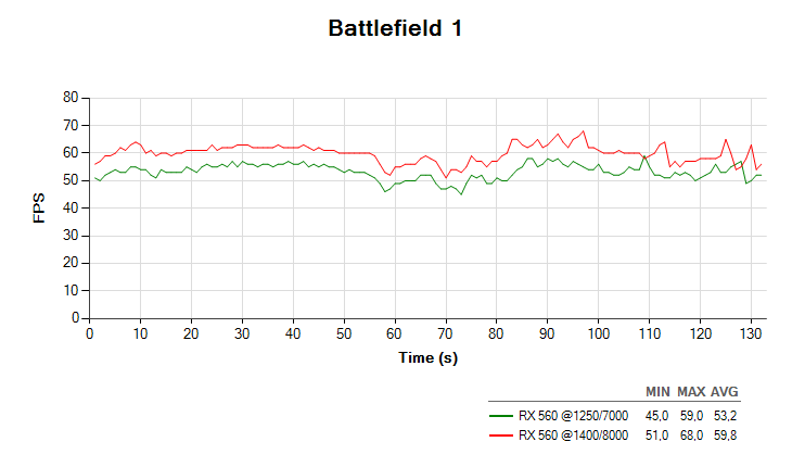 Ручные настройки из прошлой записи, разрешение 1920x1080. Здесь, как и в Battlefield 1, видеокарта RX 560 чувствует себя отлично, несмотря на то, что среднее значение частоты кадров снова несколько ниже заветной отметки в 60.