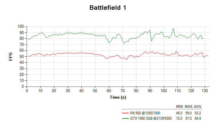 Ручные настройки из прошлой записи, двукратный мультисемплинг, разрешение 1920x1080. Здесь RX 560 уже чувствует себя куда хуже, средний фреймрейт уже гораздо ниже, и по отношению к результату GTX 1060 падение прозводительности оказалось более существенным, чем в случае с Battlefield 1.