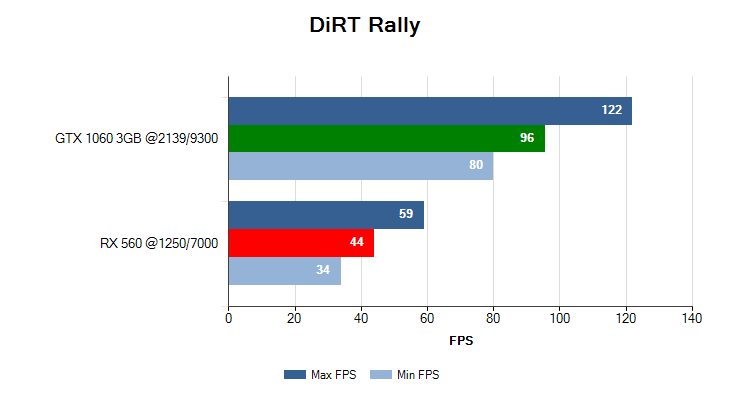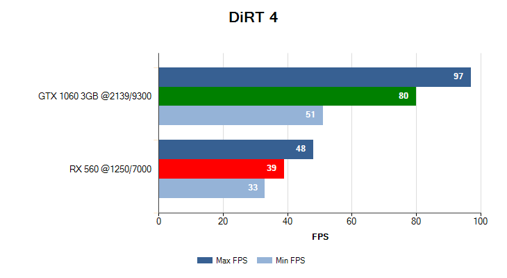 Максимальный пресет графики, четырехкратный мультисемплинг, разрешение 1920x1080. Ситуация примерно такая же, как и в DiRT 4, хотя соотношение результата RX 560 к результату GTX 1060 здесь лучше.