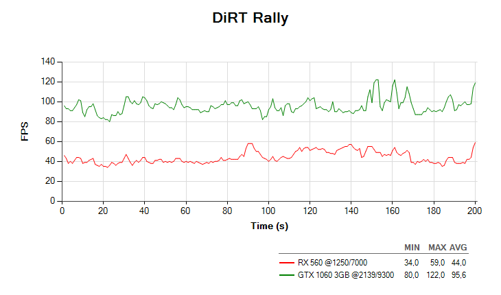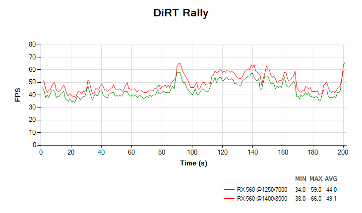 Кроме того, если вы обратите внимание на мониторинг загрузки GPU, то заметите, что у видеокарты еще остался некоторый запас. Именно это позволило этой видеокарте с таким существенным отрывом по отношению к RX 560 выступать в играх, вроде DiRT Rally, с использованием восьмикратного мультисемплинга.
