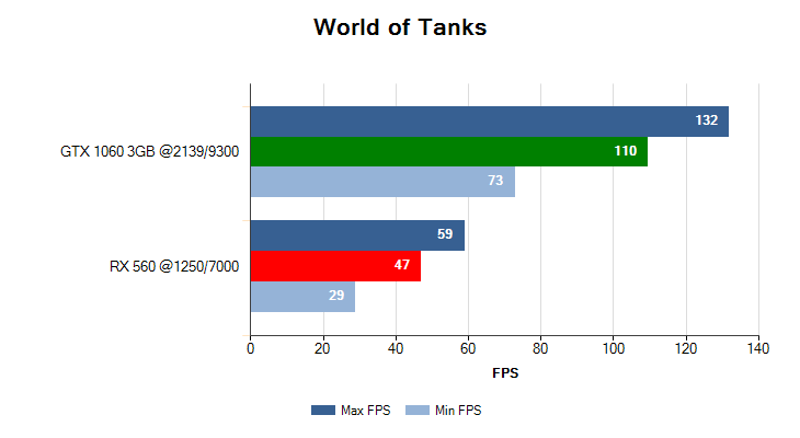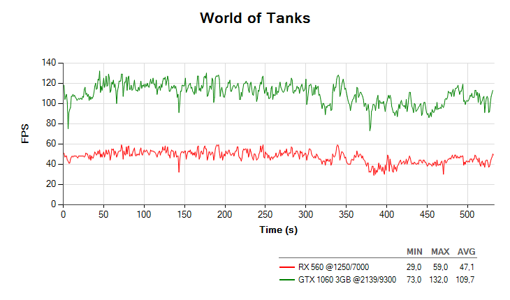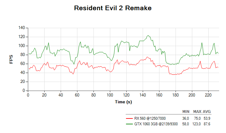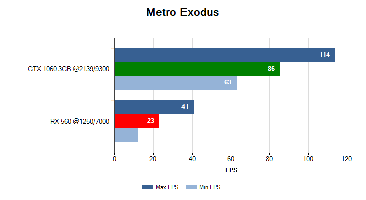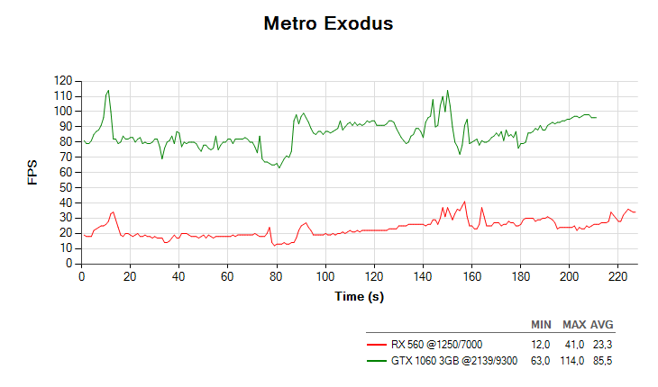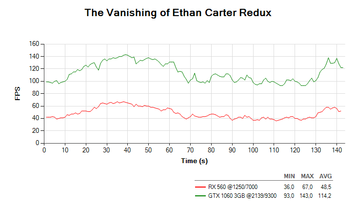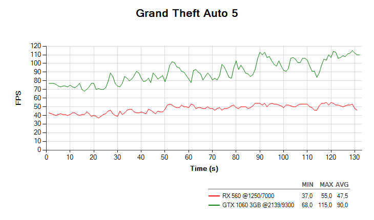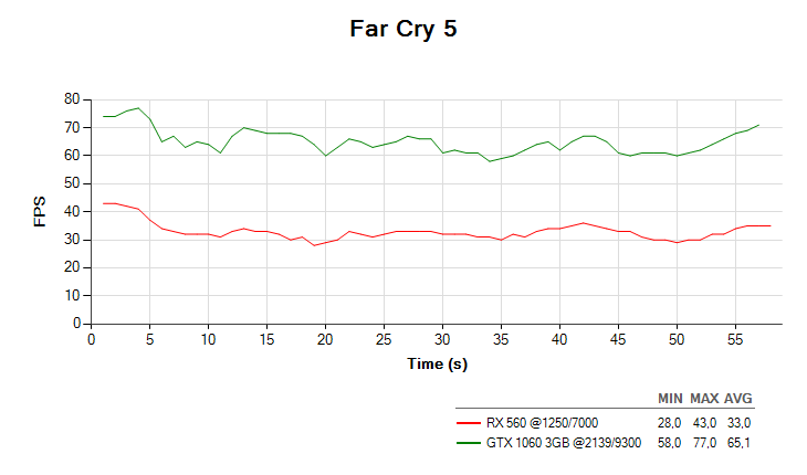Максимальный пресет настроек графики, разрешение 1920x1080. RX 560 показывает ровно половину от результата GTX 1060. Пожалуй, ничего необычного.