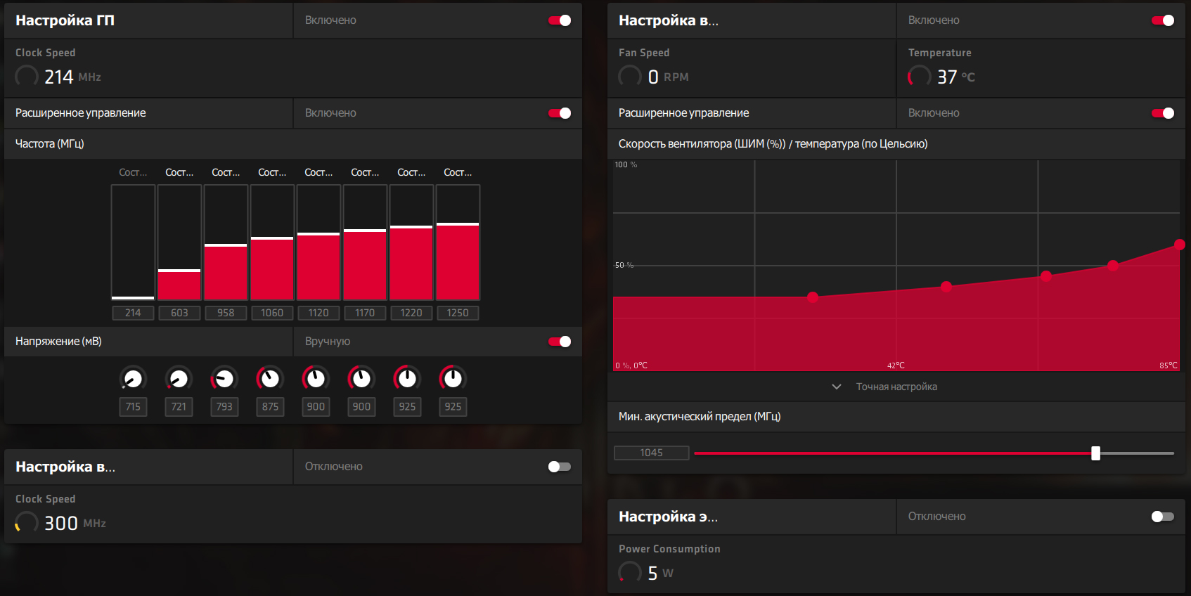 Правда сейчас, после некоторых ручных правок частоты и напряжения, вентиляторы перестали останавливаться в пассивном режиме и теперь постоянно крутят на минимальных оборотах, хотя я их работы вообще не касался и ранее при тех же самых настройках они останавливались. Теперь же остановка вентиляторов происходит только при выборе автоматического управления вентиляторов. Впрочем, это не единственные особенности драйвера. Например, в меню игровых настроек присутствуют пункты Radeon Image Sharpening и Radeon Boost, которые можно даже активировать. Но толку от этого никакого нет, они просто не работают. И если в случае с Radeon Image Sharpening мне удалось с лупой у экрана разыскать в интернете сноску о том, что данная технология не работает на видеокартах RX 550 и RX 560 (но при этом работают на видеокартах RX 570, RX 580, RX 590, которые основаны на том же самом чипе, что попахивает каким-то откровенным кидаловом), то в случае с Radeon Boost никакого уточнения по поводу RX 560 я не нашел. Почему нельзя было сделать так же, как они сделали с пунктом FreeSync – она просто неактивна и подписано, что функция банально недоступна, я не знаю.