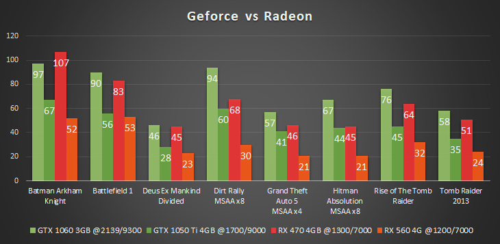 Заметили какую-нибудь тенденцию? Нет? Тогда давайте разбираться вместе. Вернее, я попытаюсь изложить свои мысли по поводу результатов этой и других (об этом ниже) видеокарт. А чтобы нам было проще понять ситуацию между видеокартами двух лагерей, предлагаю посмотреть на результаты других видеокарт. Дело в том, что за последние примерно три года помимо вышеупомянутых видеокарт и тех, что уже встречались в моих записях, через мое личное пользование прошли и другие видеокарты, в частности, RX 470. А главное, все эти видеокарты я тестировал в одних и тех же играх на одних и тех же настройках. И у меня есть эти результаты. Их количество, к сожалению, невелико, но все-таки они есть. В итоге мы имеем возможность сравнить между собой RX 470, GTX 1060 3GB, RX 560 и GTX 1050 Ti. Единственное, что стоит учитывать – это то, что тестировались эти видеокарты в разное время, и самая ранняя из них – это RX 470, было это три года назад, когда видеокарта только вышла, следовательно, и версия драйверов тогда была еще самая ранняя, поэтому ее актуальная производительность на свежих драйверах может быть несколько выше. Кроме того, обращайте внимание на частоты. GTX 1060 3GB тестировалась в приличном разгоне до 2139/9300 МГц, для GTX 1050 Ti частота видеопамяти тоже была увеличена до 9000 МГц (а вот чип разгону практически не поддавался). В то же время что RX 470, что RX 560 принимали участие на сниженных значениях напряжения при штатной частоте видеопамяти. Причем та первая версия RX 560, что у меня была на тот момент, имела даже еще более низкие частоты, что-то порядка 1176 МГц. Это даже ниже, чем у моего текущего варианта на сниженном напряжении. Впрочем, нас интересуют не сами результаты как таковые, а их соотношение и закономерность.
