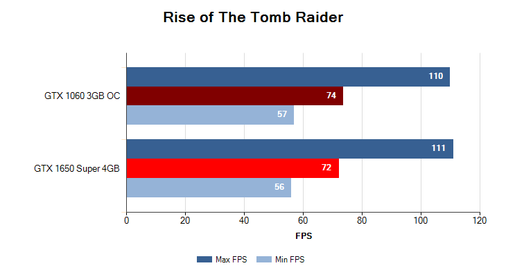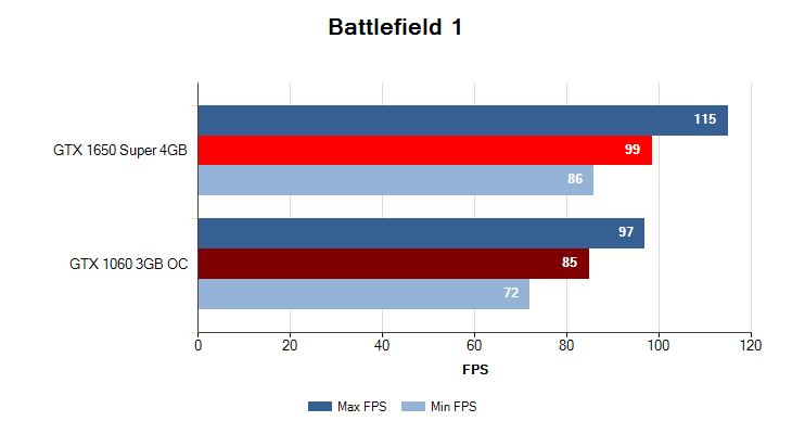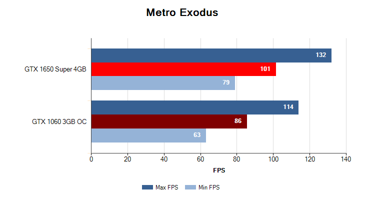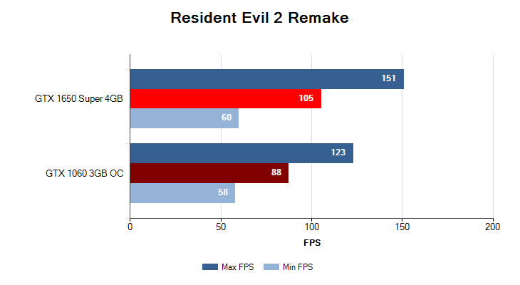 Максимальный пресет настроек графики, разрешение 1920x1080. GTX 1650 Super 4GB снова берет верх над GTX 1060 3GB с отрывом в 15%.