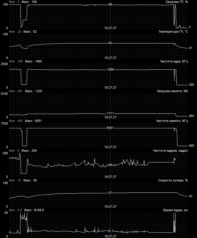 По каким-то причинам ни одна программа не видит обороты вентилятора видеокарты, доступны значения только в процентах, поэтому довольствоваться придется уровнем в процентах. Данная версия видеокарты не поддерживает режим полной остановки вентилятора при низких температурах, в режиме простоя без нагрузки обороты составляют 35%, а уровень шума в целом не выделяется на фоне других компонентов ПК. Под нагрузкой обороты возрастают до 57%, температура достигает отметки в 62 градуса, а уровень шума возрастает и становится отчетливым, он выделяется на фоне остальных компонентов ПК, впрочем, назвать его особенно громким нельзя, он умеренный, чем-то напоминающий уровень референсных видеокарт Nvidia поколения Pascal.