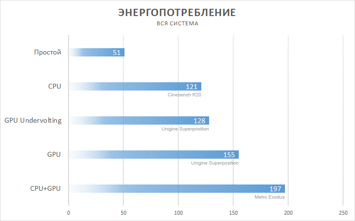 Замер энергопотребления осуществлялся бытовым ваттметром, поэтому в графике это значение отражает энергопотребление всей системы из розетки. Для объективности результата я делал разные замеры под разной нагрузкой (нагрузка на процессор, нагрузка на видеокарту, нагрузка на процессор и видеокарту) и в простое. Заявленный уровень энергопотребления для данной видеокарты составляет 100 ватт. Программы мониторингов рапортуют в среднем о значениях близких к этой цифре при нагрузке на видеокарту. При андервольтинге это значение снижается примерно до 70 ватт. Энергопотребление процессора составляет порядка 60 ватт.