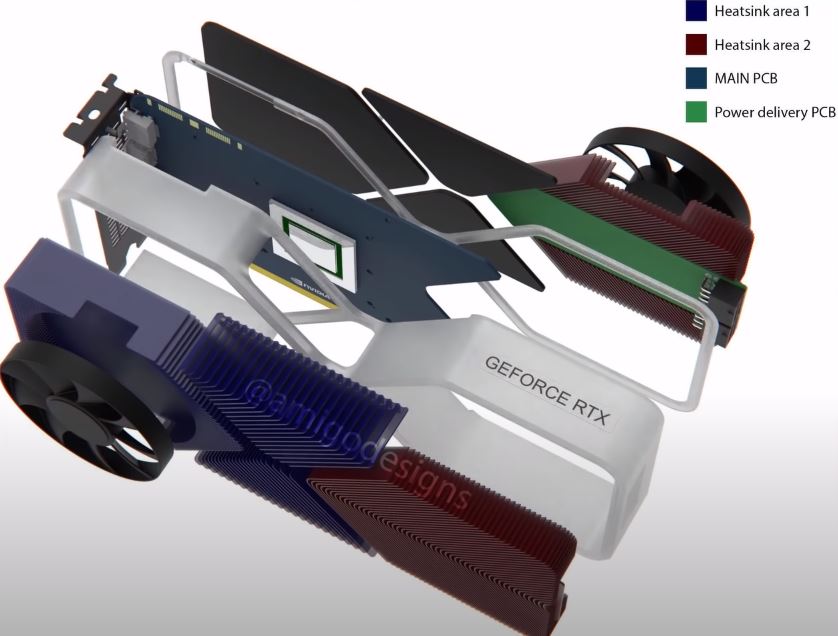 В референсных версиях появится новый тип охлаждения с двумя вентиляторами: из-за того, что будет целых два чипа. Первый - знакомый нам графический, а на обратной стороне - новый, с тензорными ядрами для обработки лучей.