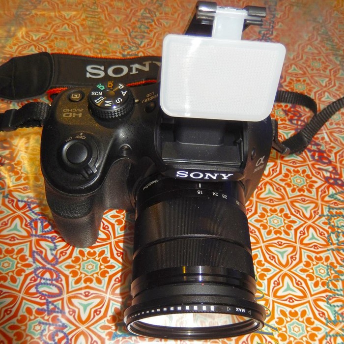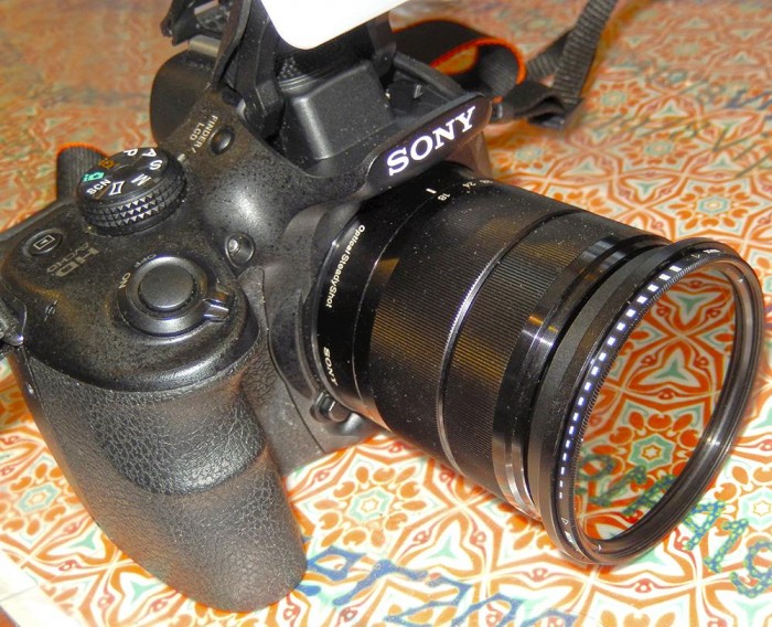 Фото светофильтра на KIT-овом объективе Sony SEL1855, поставленном на беззеркальный фотоаппарат Sony Alpha A3000, вид сверху, под небольшим наклоном.