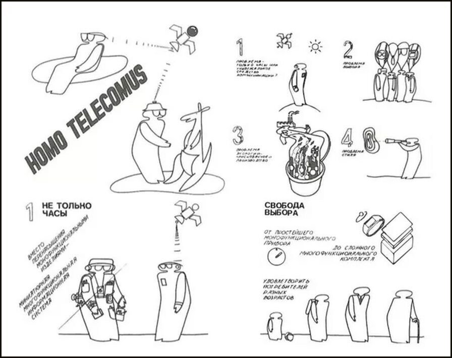 В представлении советских изобретателей часы "Хомо телекомус" должны были подключаться к Всемирной информационной сети. Для справки, прообраз современного интернета появился ещё в конце 1969 года. Летит человек из Москвы в Будапешт и хочет узнать, какая там погода и точное местное время. Не проблема, подключился к сети и посмотрел.