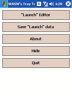 <br/>После запуска приложения вы увидите полно-экранное окно с кнопками и в трее кпк появиться значок с двумя буквами Т. При клике по этому значку, вы увидите меню с действиями: