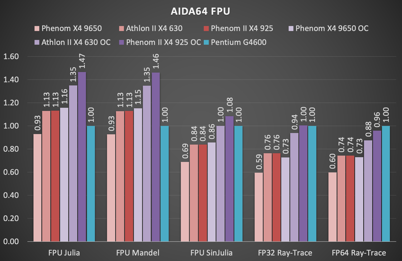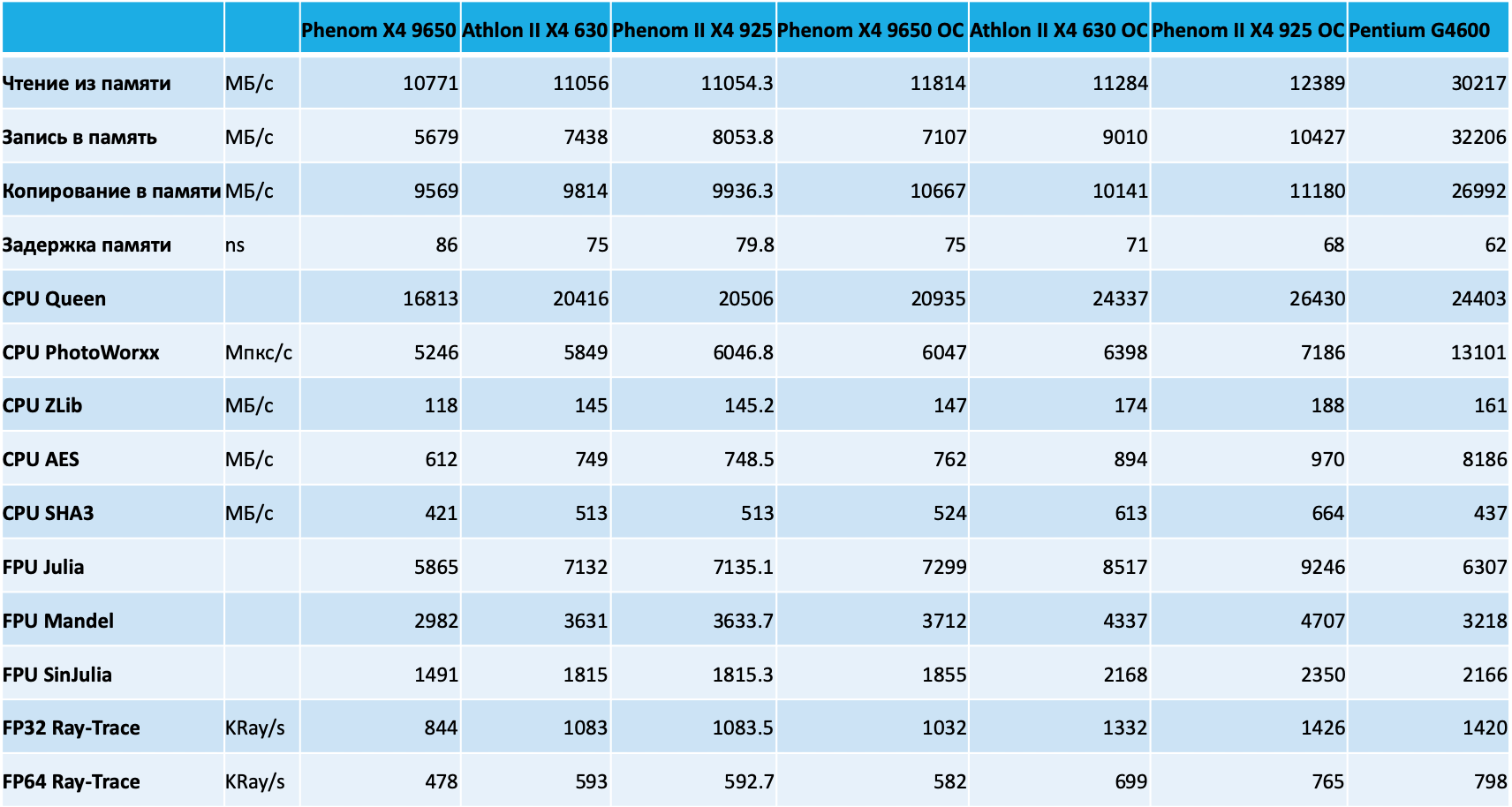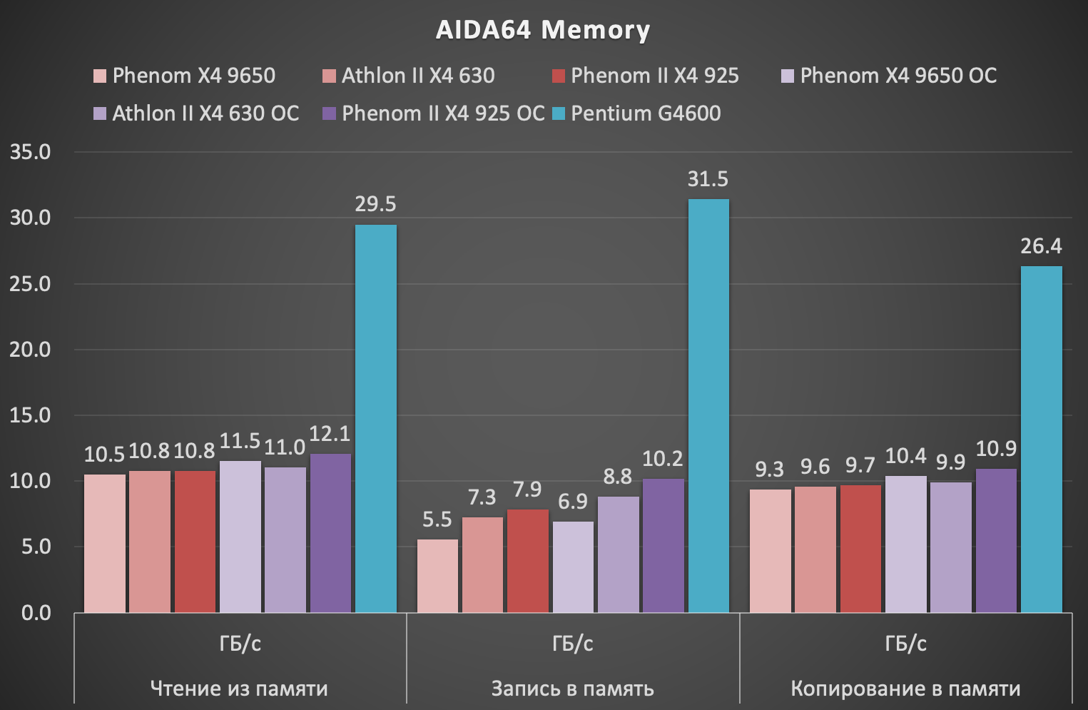 Комплексный разгон, результатом которого стало увеличение не только частоты процессора, но и контроллера памяти, несколько увеличил производительность подсистемы памяти представителей микроархитектуры K10, но в целом на фоне G4600 с DDR4-2400 памятью результаты по-прежнему не впечатляют.