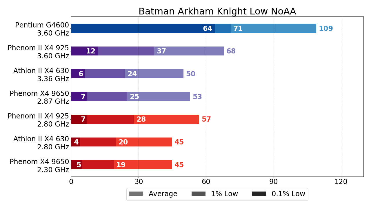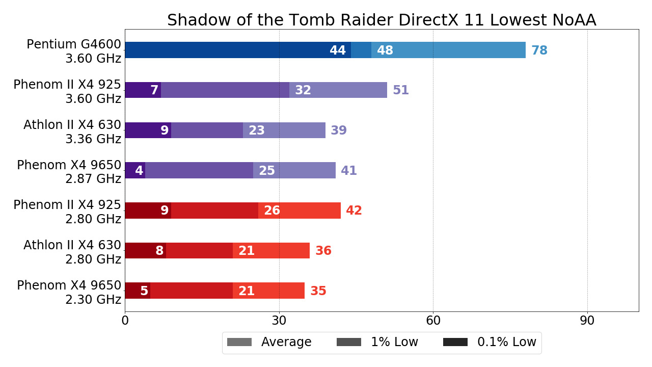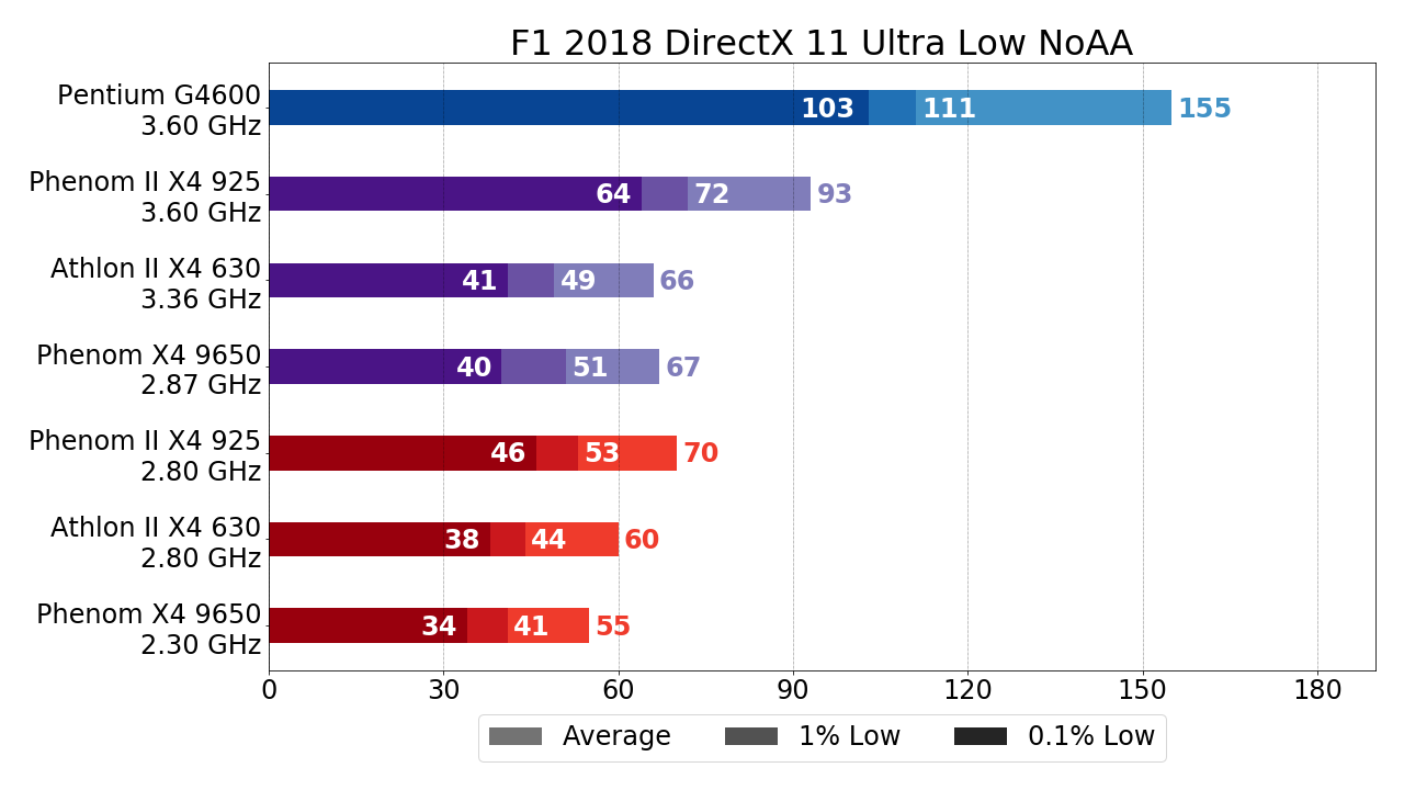 Grand Theft Auto V — не самая последняя игра на "движке" Rockstar Advanced Game Engine (RAGE), вот только более актуальная Red Dead Redemption 2 на тестируемых стареньких процессорах AMD падает при попытке запуска внутриигрового бенчмарка, так что отстаивать честь "движка" RAGE будет таки GTA V. Разгон, как видим, несколько увеличивает показатели FPS, но качественно картины не меняет. Благо, что известной своей хорошей оптимизацией GTA V вполне достаточно протестированных 4-ядерных процессоров AMD и "в стоке", так как даже Phenom первого поколения способен обеспечить практически стабильные 30 FPS. Здесь же отметим (и далее не будем всякий раз заострять на этом внимание), что Athlon II X4 630, несмотря на неплохое превосходство в тактовой частоте, практически не отрывается от Phenom первого поколения — дополнительных 0.5 ГГц частоты достаточно лишь чтобы нивелировать полное отсутствие L3-кэша. Так же напомню, что показатели 0.1% малых FPS в случае G4600 здесь следует проигнорировать в силу особенностей игрового "движка" RAGE.