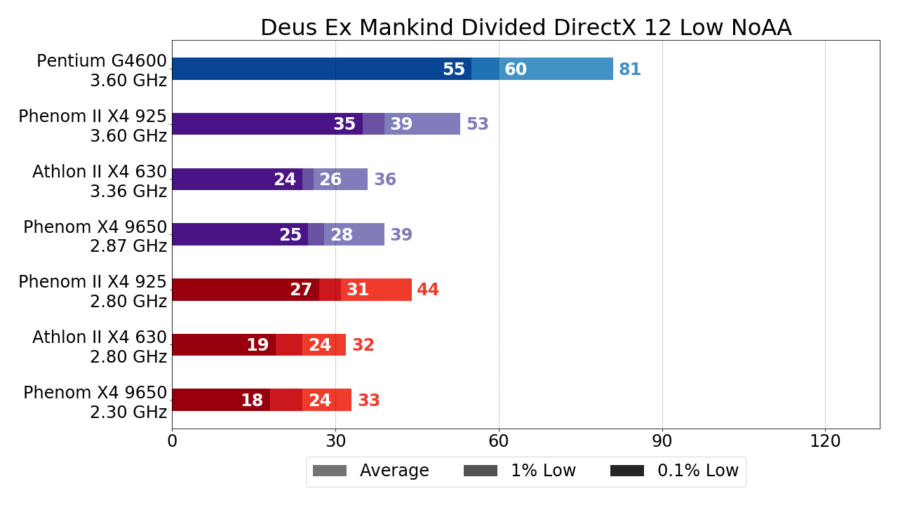В прошлый раз мы уже отмечали, что с одной стороны "движок" Dawn Engine, использующийся в Deus Ex: Mankind Divided, не питает особой любви к процессорам AMD, а с другой — является редким примером "движка", в играх на котором использование API DIrectX 12 позволяет добиться существенно более устойчивой частоты кадров на тестируемых 4-ядерных чипах. В купе же с разгоном использование DirectX 12 вплотную приближает нас к заветным стабильным 30 FPS, а Phenom второго поколения даже преодолевает эту планку с небольшим запасом. Впрочем, Phenom II X4 925 в разгоне справляется и в DirectX 11 режиме, а вот остальным "старичкам" использование DirectX 11 противопоказано.