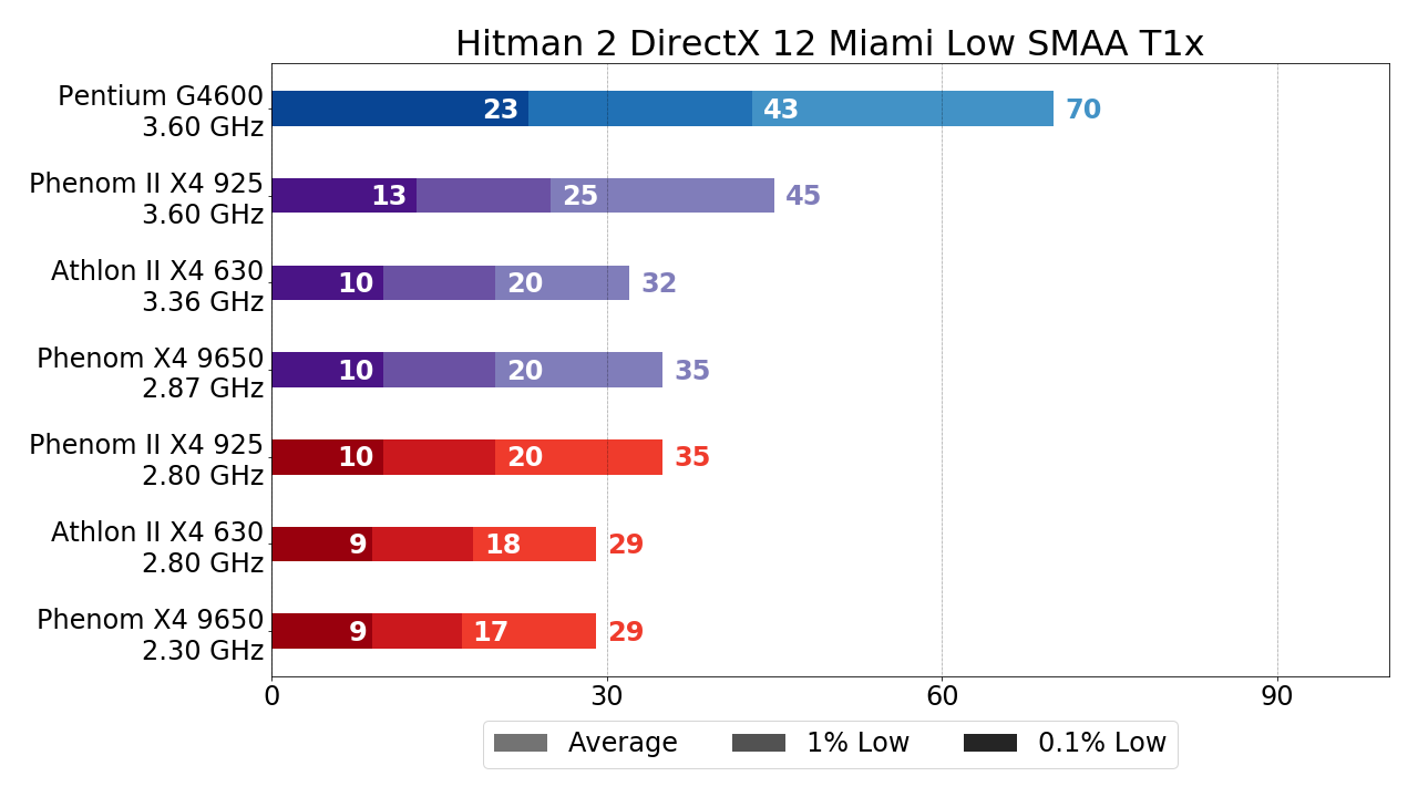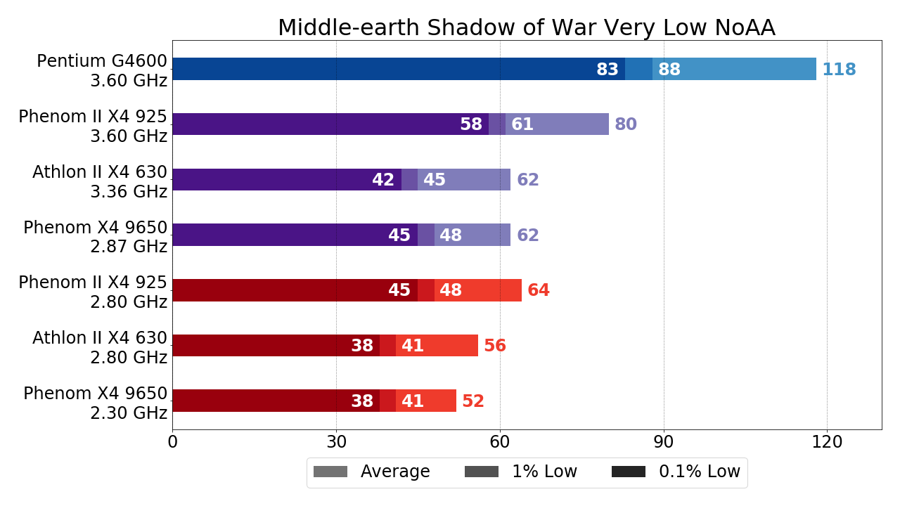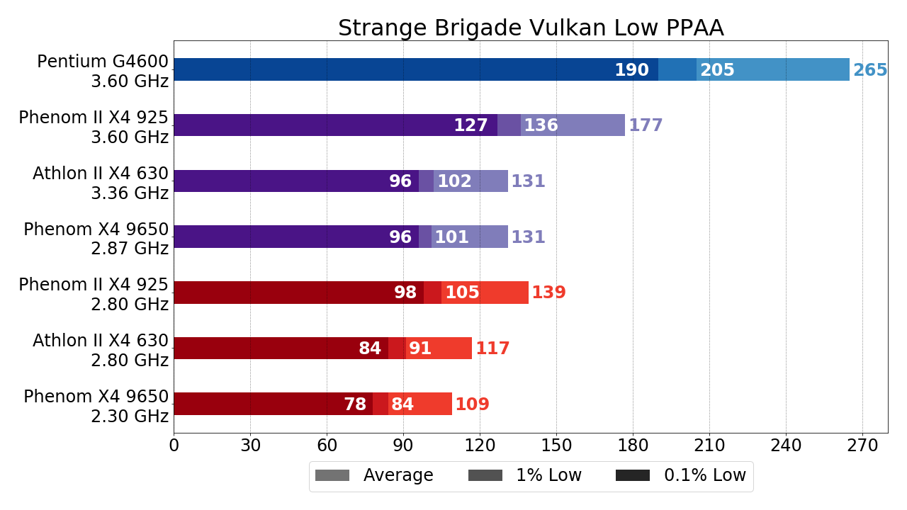 - Phenom X4 9650 за счёт чуть большего разгона уже несколько обходить Athlon II X4 630, но это не столь существенно. Куда важнее тот факт, что Phenom II X4 925 обходит упомянутые процессоры на треть по показателям среднего и 1% низких FPS и более чем вдвое по показателю 0.1% низких FPS. Исходя из этих цифр (в случае, если разгон возможен, конечно) двукратную переплату за L3-кэш в Phenom II X4 относительно Athlon II X4 оправдать вполне себе можно, ну а если принять во внимание тот факт, что зачастую граница играбельности при использовании Phenom II X4 925 достигается как раз за счёт упомянутого прироста, то рекомендовать к покупке с целью "пересидеть" здесь и сейчас "на минималках" стоить именно Phenom II X4.