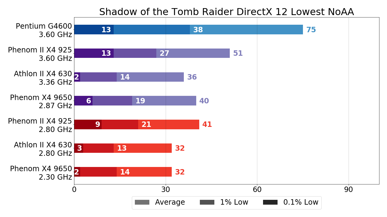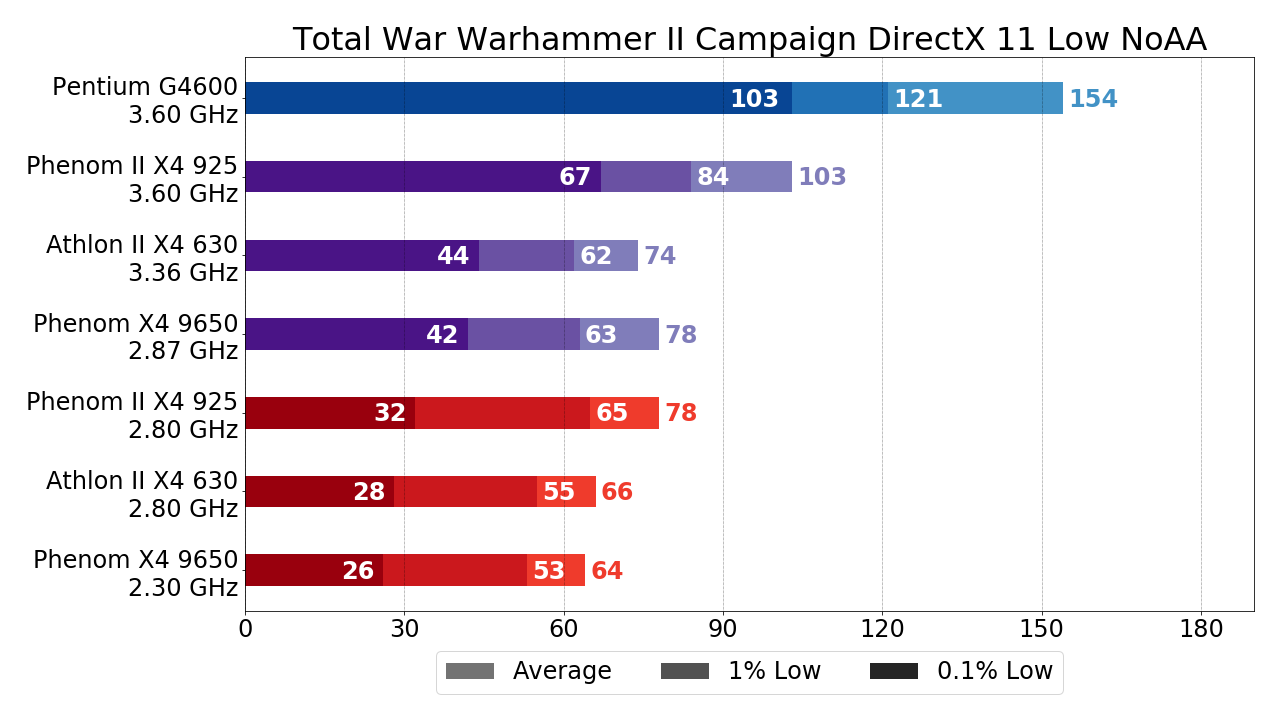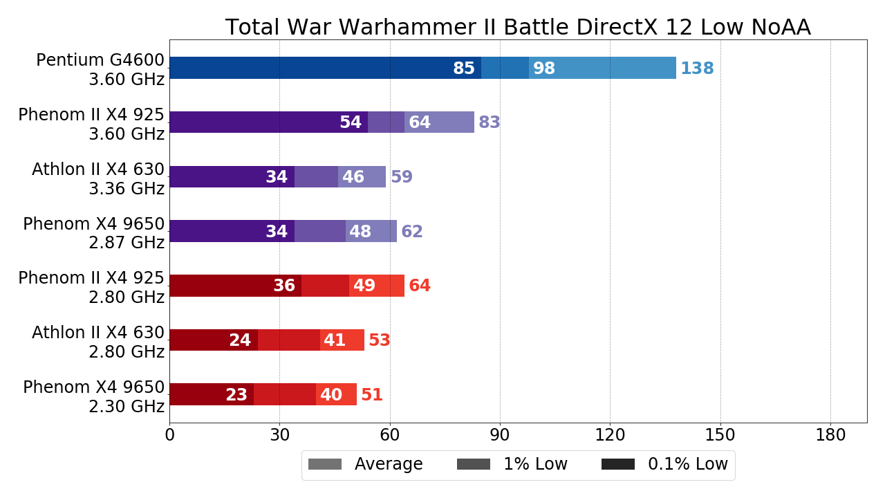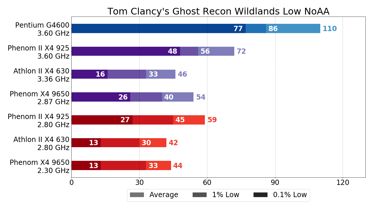 - Phenom X4 9650 за счёт чуть большего разгона уже несколько обходить Athlon II X4 630, но это не столь существенно. Куда важнее тот факт, что Phenom II X4 925 обходит упомянутые процессоры на треть по показателям среднего и 1% низких FPS и более чем вдвое по показателю 0.1% низких FPS. Исходя из этих цифр (в случае, если разгон возможен, конечно) двукратную переплату за L3-кэш в Phenom II X4 относительно Athlon II X4 оправдать вполне себе можно, ну а если принять во внимание тот факт, что зачастую граница играбельности при использовании Phenom II X4 925 достигается как раз за счёт упомянутого прироста, то рекомендовать к покупке с целью "пересидеть" здесь и сейчас "на минималках" стоить именно Phenom II X4.