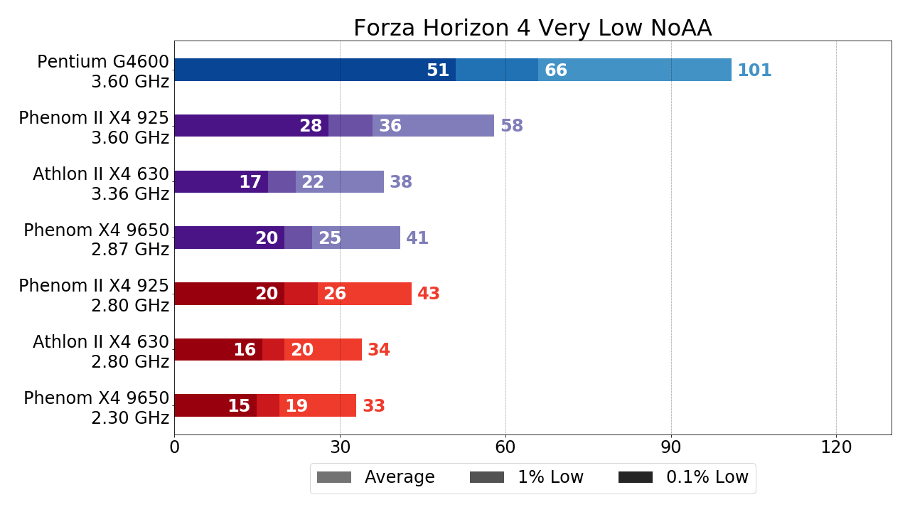 Forza Horizon 4 на "движке" ForzaTech вполне себе довольствуется современным 4-поточным "гиперпнём", а вот "старичкам" AMD откровенно тяжело — стабильные 30 FPS вновь способен обеспечить лишь Phenom II X4 в разгоне.