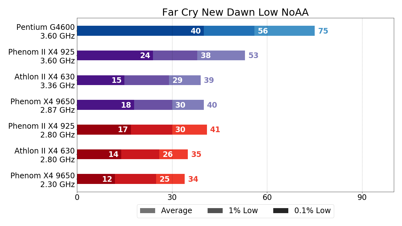 Far Cry New Dawn, использующий "движок" Dunia Engine лишён поддержки современных API (DirectX 12 или Vulkan) и вновь результатах 4-ядерных "старичков" невпечатляющие да и разгон в целом не сильно помогает — к стабильным 30 FPS подбирается лишь Phenom II X4 в разгоне.