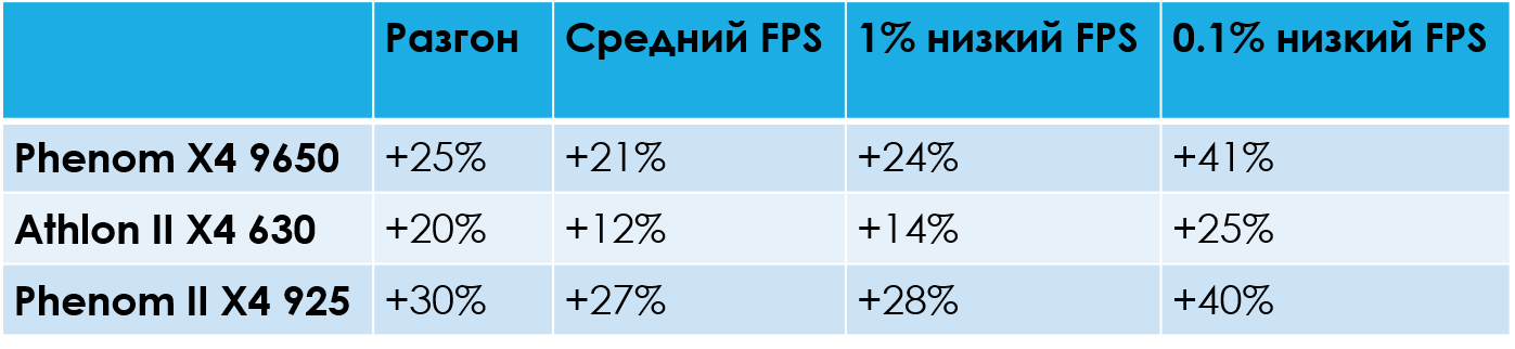 - Разгон процессоров разный, однако, стоить взглянуть на таблицу с приростом показателей игровой производительности от разгона, приведённую выше, как сразу же становится ясно, кто здесь "третий лишний" — мало того, что Athlon II X4 страдает от отсутствия L3-кэша в стоке, так ещё и (стоит думать, что по той же самой причине) получает меньше от разгона.