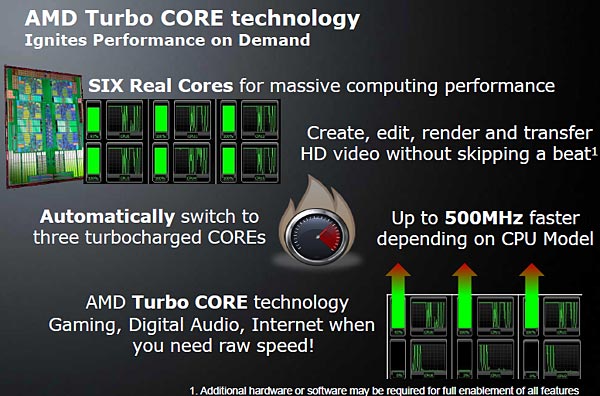 Кроме того, на практике тактовые частоты 6-ядерных чипов пускай и незначительно, но всё же уступали таковым у 4-ядерных моделей: так, например, частота старшего на момент выхода линейки Phenom II X6 1090T составляла 3.2 ГГц, а старший на тот момент Phenom II X4 970 мог похвастаться 3.5 ГГц. Впрочем, у AMD имелся ответ на эту досадную ситуацию — явленная миру технология Turbo Core могла в ситуации, когда загруженными оказывались менее 4 ядер, повышать частоту одной половины ядер на несколько сотен МГц, при этом существенно замедляя вторую неиспользуемую половину ядер. Таким образом, новые 6-ядерные процессоры должны были быть, как минимум, не медленнее своих 4-ядерных предшественников даже в приложениях, не оптимизированных под многопоточность.