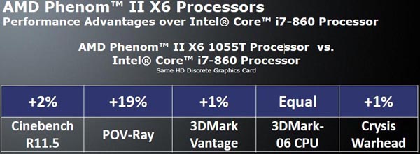 Касательно конкуренции на момент выхода Phenom II X6 необходимо отметить, что первые 6-ядерные процессоры AMD для настольных ПК серьёзно уступали первому же 6-ядерному предложению конкурента в лице Core i7-980X — даже будучи разогнанными выше 4 ГГц, Phenom II X6 не были способны обеспечить превосходство над предложением Intel в большинстве задач. Однако, 6-ядерные Phenom II никогда и не позиционировались как конкуренты более чем втрое превосходившему из по стоимости Core i7-980X (Bloomfield) на в целом дорогой HEDT-платформе LGA1366, а были нацелены на конкуренцию с 4-ядерными Core i5 и i7 (Lynnfield) для "обычной" настольной платформы LGA1156.