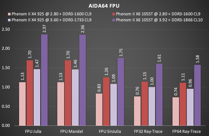 Тесты производительности вычислительных блоков ЦП также демонстрируют уже привычную картину — в большинстве тестов 6-ядерный Phenom II X6 "в стоке" наступает "гиперпню" на пятки или даже незначительно обгоняет последнего, а в разгоне способен без труда обойти современный 2-ядерник, причём преимущество может быть более чем двукратным. В очередной раз отметим, однако, что на практике реализуется подобный сценарий только в случае, если используемое программное обеспечение хорошо масштабируется на большое количество потоков, не упирается в производительность подсистемы памяти и мало что получает от использования новых инструкций. И в отличие от синтетических бенчмарков, в реальных приложениях, и особенно в играх, такая ситуация, скорее, редкость.