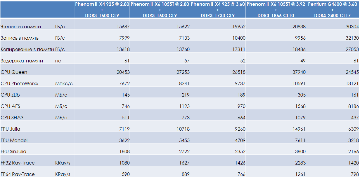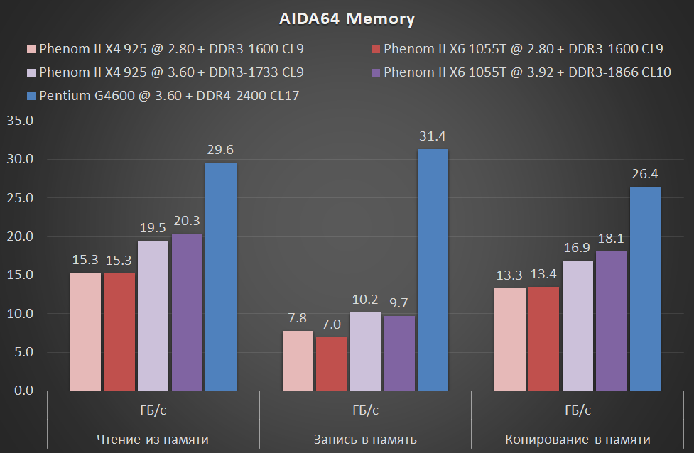 Результаты в тестах памяти по-прежнему не впечатляют — даже в комплексном разгоне (увеличение не только частоты процессора, но и контроллера памяти), представители микроархитектуры K10 в связке с DDR3-1600 памятью значительно отстают от G4600 с DDR4-2400 памятью. Причём, результаты Phenom II X6 в тестах записи даже несколько хуже таковых у Phenom II X4, что, скорее всего, объясняется тем простым фактом, что архитектурно идентичному контроллеру памяти в 6-ядерном процессоре приходится обслуживать на 50% большее число ядер.