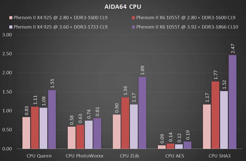 Первый стенд оснащён 2 планками DDR3-1600 CL9 памяти с Aliexpress объёмом по 4 ГБ каждая, о которой подробнее писалось в прошлой заметке, второй — 2 планками DDR4-2400 CL17 памяти так же объёмом по 4 ГБ каждая. Процедура разгона на платформе AM3 принципиально ничем не отличалась от описанной ранее для AM2+, ограничения те же — не выше 1.5 В на ядра и встроенный контроллер памяти. Phenom II X4 925 продемонстрировал идентичный ранее полученному с использованием платы GIGABYTE GA-MA770-UD3 (rev. 2.0) разгонный потенциал — 260 МГц "по шине" и 3.6 ГГц итоговой частоты ядер, Phenom II X6 1055T показал себя чуть лучше, покорив планку в 280 МГц "по шине", почти добравшись до 4 ГГц по частоте ядер. Множитель встроенного контроллера памяти 10 в обоих случаях, что даёт эффективную частоту работы этого узла 2.6 и 2.8 ГГц соответственно. В стоке память DDR3-1600 CL9 для обоих процессоров, в разгоне DDR3-1733 CL9 и DDR3-1866 CL10 для Phenom II X4 и X6, соответственно. В последнем случае предпочтение были отдано более высокой частоте и чуть более высоким же таймингам, так как оставаясь на CL9 можно было получить лишь DDR3-1493, что хуже по производительности, чем даже вариант "в стоке".