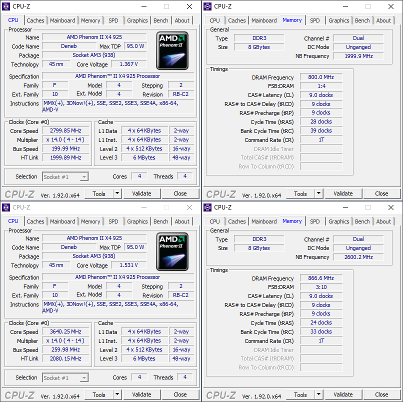 Параметры Phenom II X4 925 "в стоке" и в разгоне