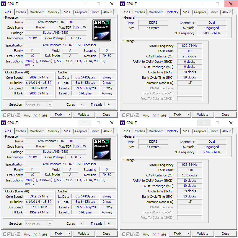 Параметры Phenom II X6 1055T "в стоке" и в разгоне