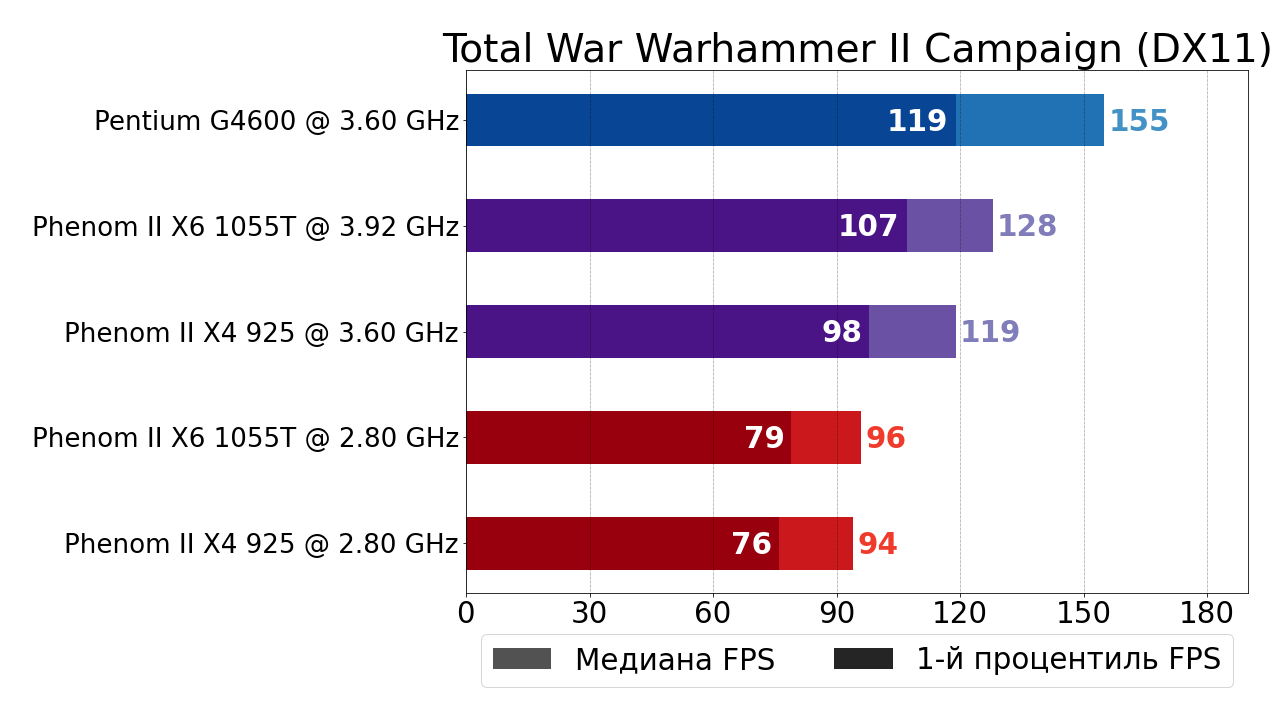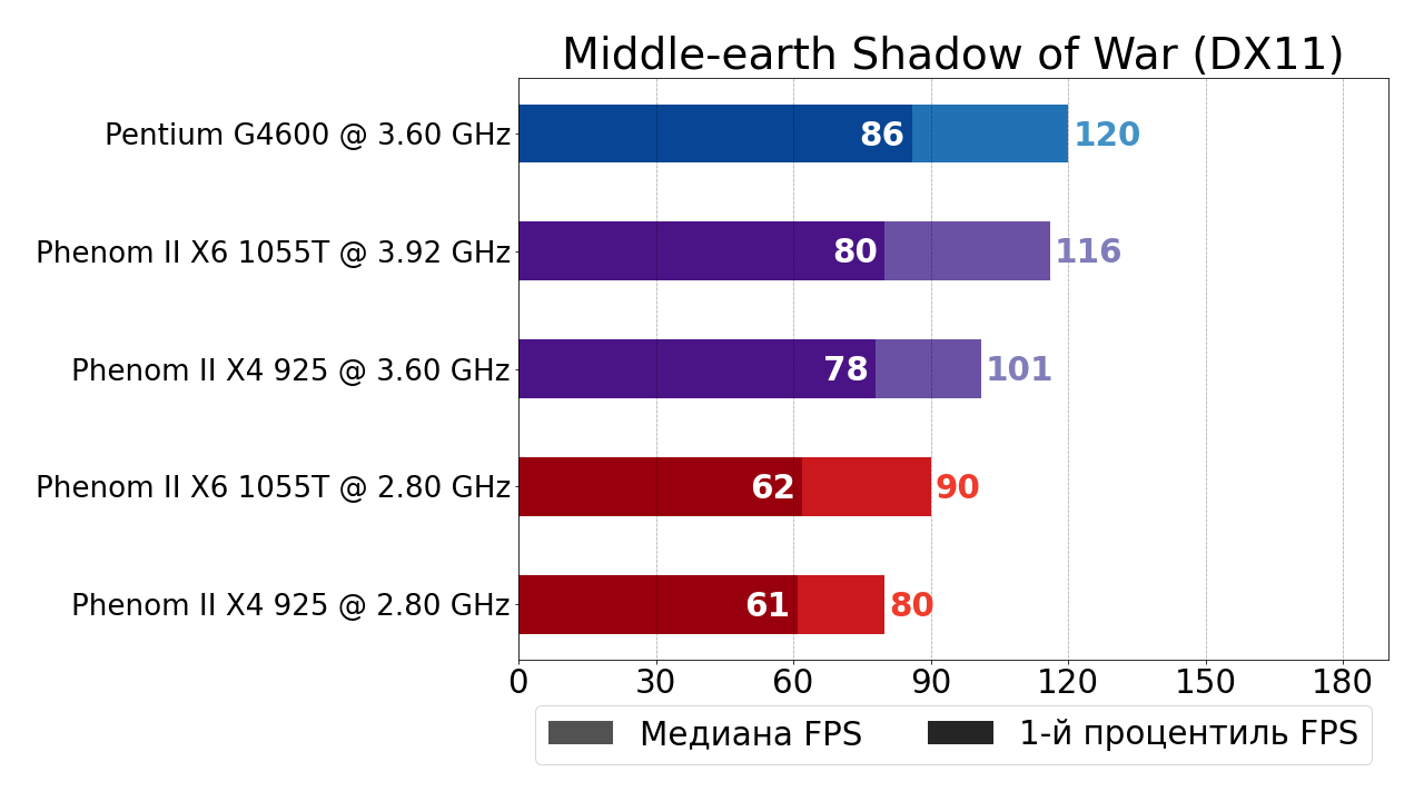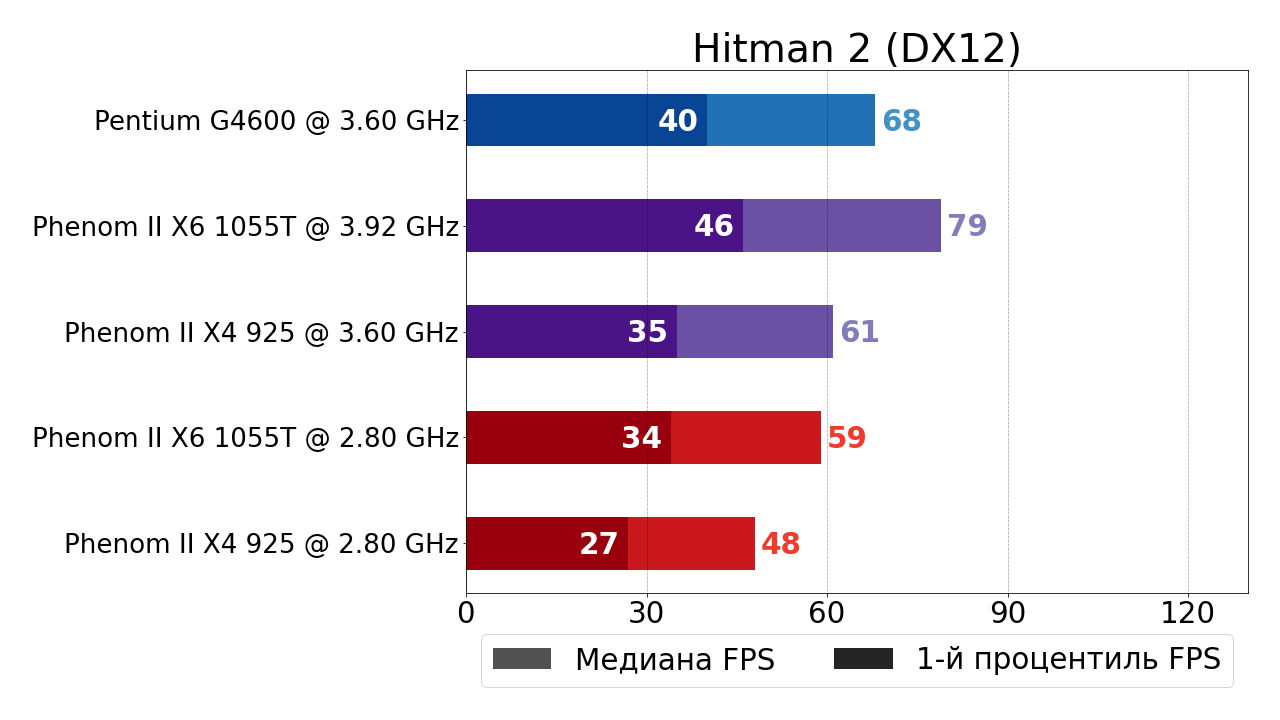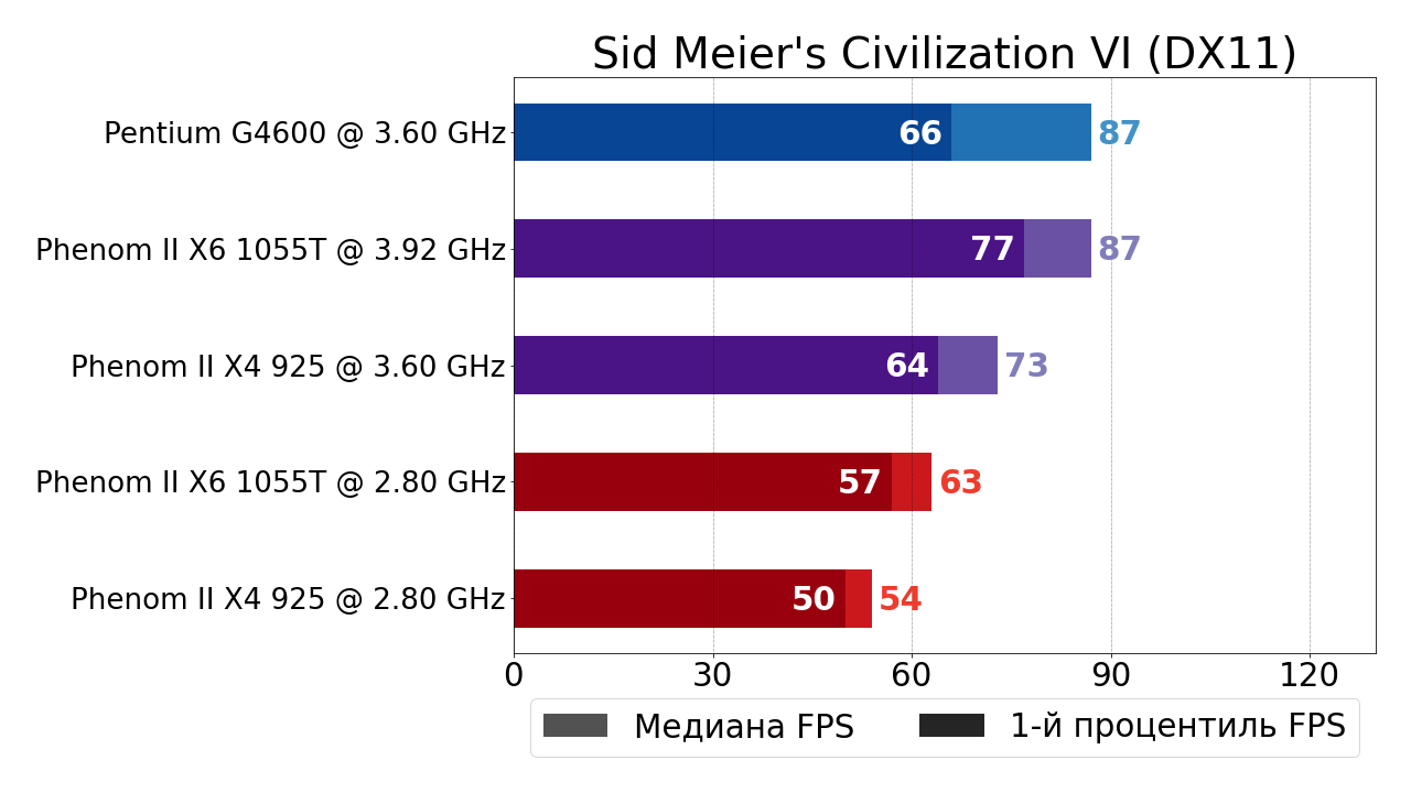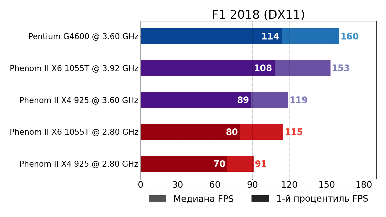 - Современный 2-ядерный 4-поточный Pentium G4600 по-прежнему обгоняет "старичка" (на сей раз в лице 6-ядерного Phenom II X6 1055T) в стоке на внушительные 32% и 27% по показателям медианного FPS и 1-ого процентиля, а вот в разгоне от преимущества "гиперпня" не остаётся и следа — Pentium G4600 всё ещё обходит разогнанный до 3.9 ГГц Phenom II X6 1055T по показателю медианного FPS, но всего лишь на 1%, а вот по 1-ому процентилю даже уступает 5%.
