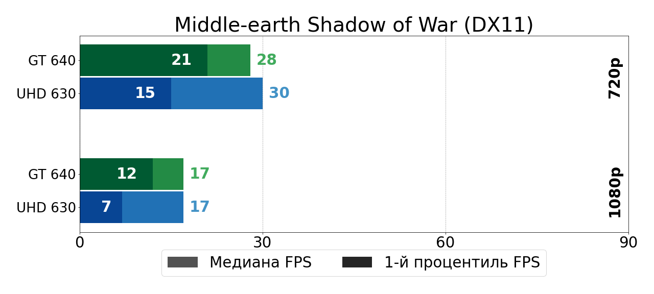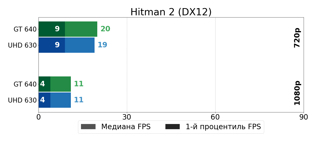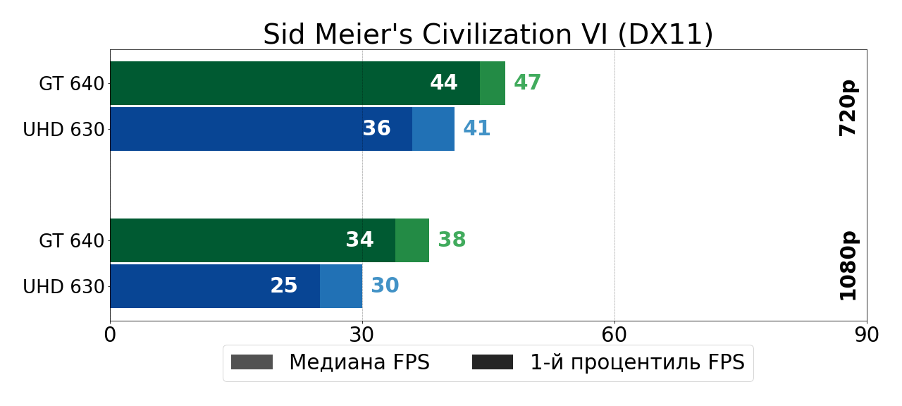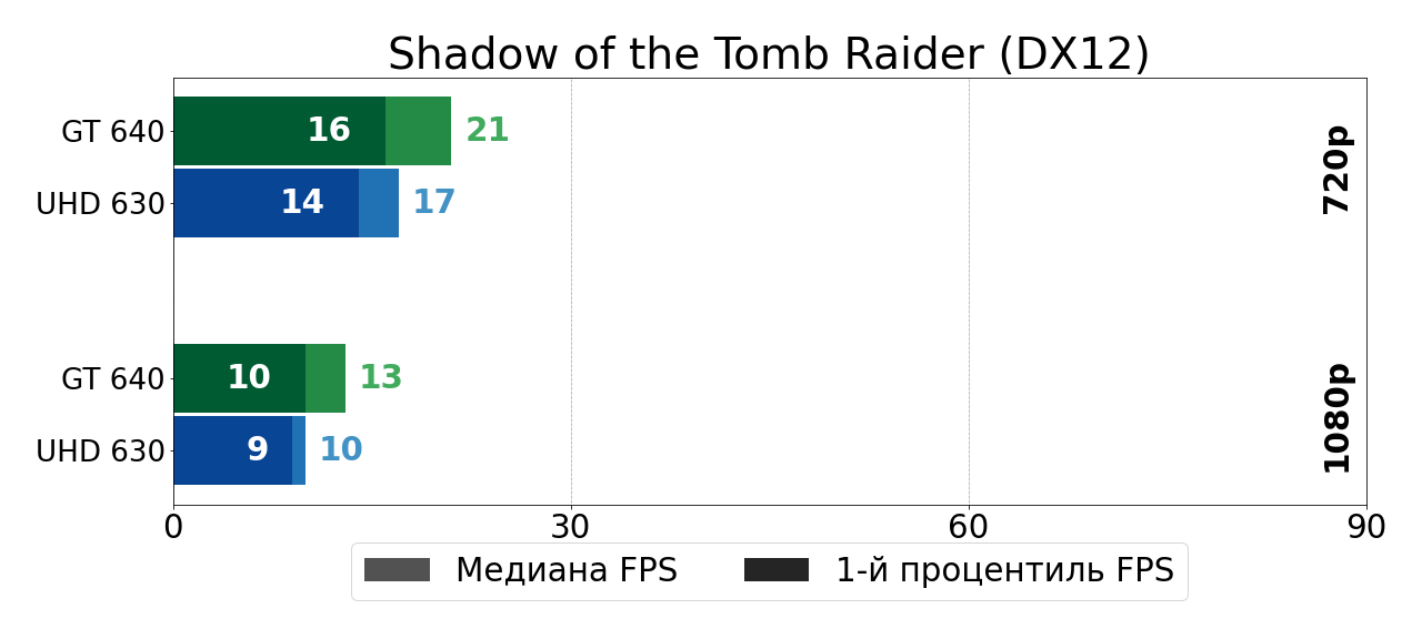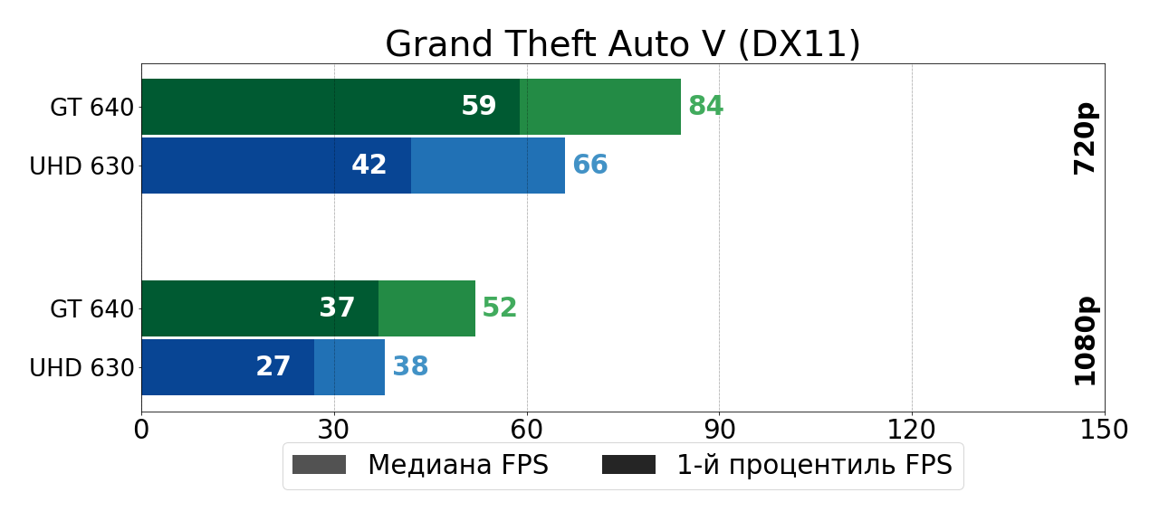 - Формально GT 640 обходит "встройку" Intel UHD 630 на 11% и 22% по показателям медианного FPS и первого процентиля в обоих протестированных разрешениях (HD и FHD), или на 10% и 19% и 12% и 26% отдельно в HD и FHD разрешении, соответственно. Преимущество, впрочем, чисто номинальное, так как ни в одном протестированном проекте оно не выводит GT 640 на какой-то иной уровень игровой производительности — всё, что играбельно на GT 640, играбельно и на более слабой UHD 630, а всё, что неиграбельно на UHD 630, неиграбельно и на GT 640.