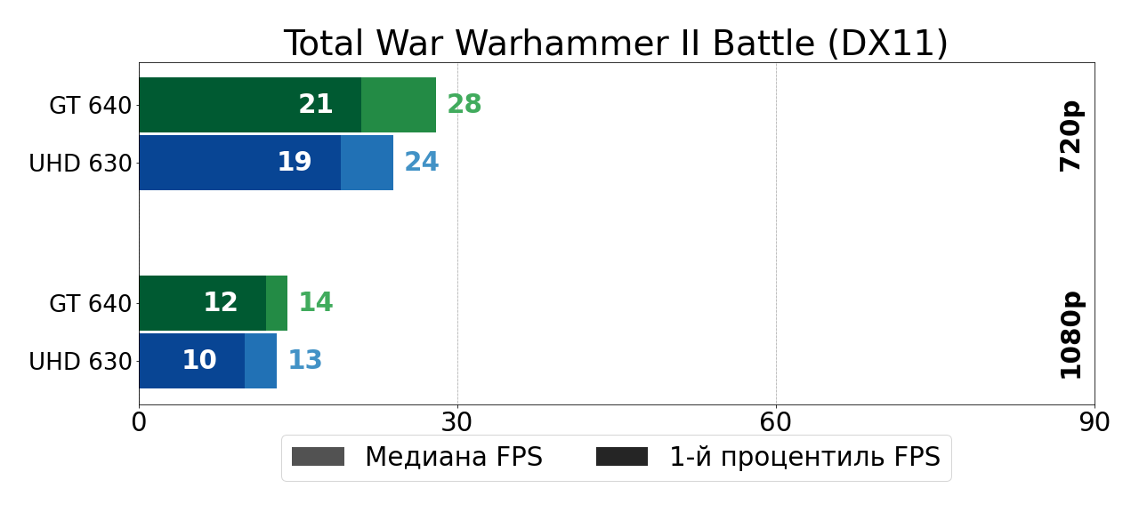 А вот Total War "шутки не шутит" — обоим участникам тяжко даже в HD, пускай GT 640 благодаря превосходству над UHD 630, составляющему 10-40%, можно считать, что плюс-минус справился в этом разрешении. В FHD игра не оставляет тестируемым ускорителям никаких шансов.