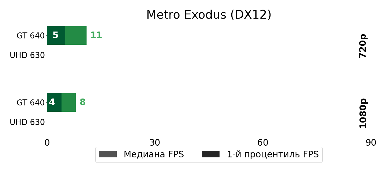 Думаю, всем известно, что последняя (на данный момент времени) часть Metro — боль даже для не самых слабых 3D-ускорителей, а у нас тут, как бы помягче выразиться, самый "начальный уровень". UHD 630 совсем "не шмогла", а GT 640 проходит бенчмарк, но смысла в этом исчезающе мало.