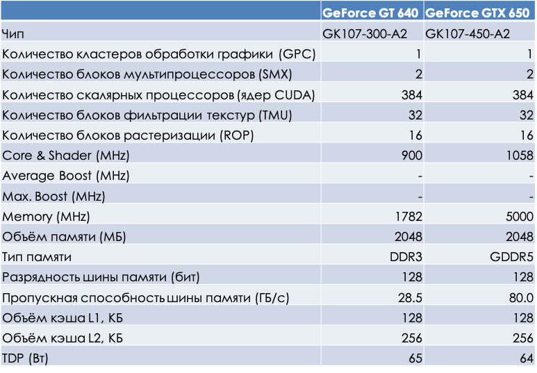 Переходим к детальному сравнению характеристик GTX 650 и GT 640.