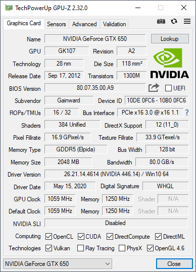 Как можно видеть из таблицы, у GTX 650 на 158 МГц выше частота ядра и шейдеров, к тому же к абсолютно идентичному 128-битному интерфейсу памяти здесь подключены уже более скоростные GDDR5-чипы. Последнее обстоятельство имеет даже большее значение, так как прирост частоты чипа незначительный (17.5%), а вот пропускная способность памяти увеличена почти в 3 раза! Фактически пропускная способность памяти в GT 640 была сильно урезана использованием медленной DDR3-памяти в целях удешевления итогового решения. Однако, полученный путём таких манипуляций продукт не завоевал ни сердца покупателей, ни (как следствие) существенную долю на рынке — несмотря на энергоэффективную архитектуру, соотношение производительности в 3D-играх к энергопотреблению у GT 640 было слишком низким по сравнению с конкурентами. В GTX 650 NVIDIA провела работу над ошибками, снабдив "младший" чип GK107 быстрой GDDR5-памятью и подняв тактовые частоты, и, надо отметить, эффект от этих изменений на практике был колоссальный — в актуальных играх тех лет GTX 650 обходила GT 640 на внушительные 40-70%! Но то было в 2012, а теперь давайте посмотрим, как оно будет в 2020.