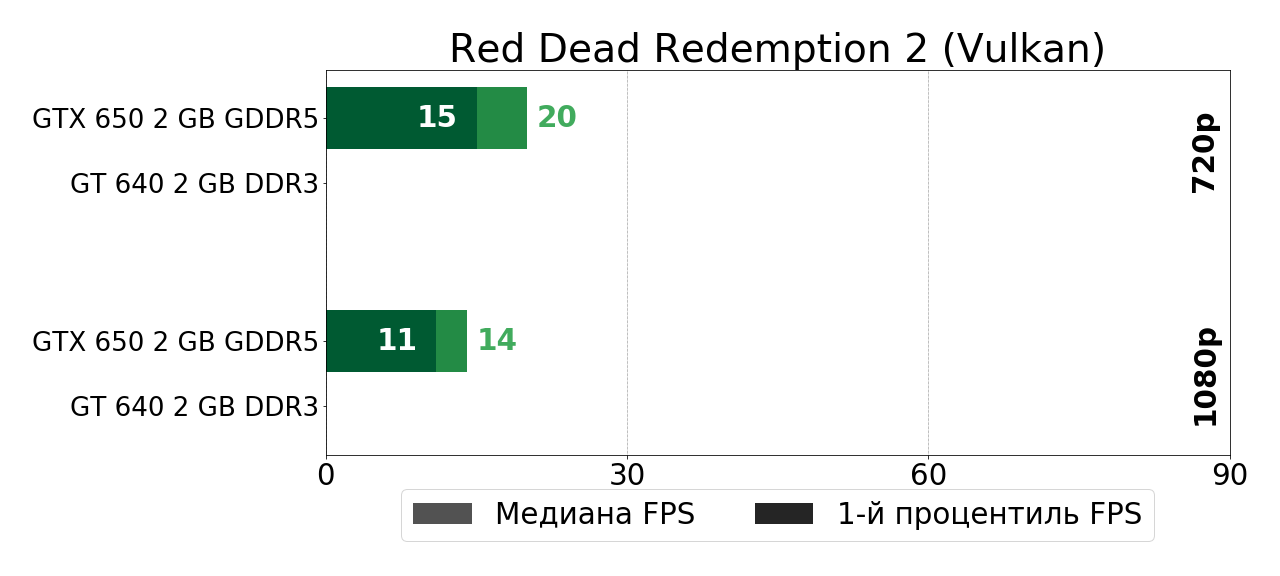 Результаты в игровых тестах демонстрируют похожую на выше озвученную по синтетическим тестам картину — в среднем показатели игровой производительности в современных AAA-проектах при переходе от GT 640 к GTX 650 возрастают на треть, и в некоторых играх (Shadow of the Tomb Raider, Assassin’s Creed Odyssey, Far Cry New Dawn, Borderlands 3) в HD-разрешении GK107 в связке с GDDR5-памятью уже почти дотягивает до 30 средних FPS с незначительными просадками, в то время как DDR3-память удерживает производительность того же чипа на отметке в 20 FPS в среднем. Не "вау", конечно, но уже что-то. Ах да, ещё на GTX 650 удалось пройти бенчмарк Red Dead Redemption 2, правда, с вполне ожидаемым результатом "неиграбельно" даже в HD.