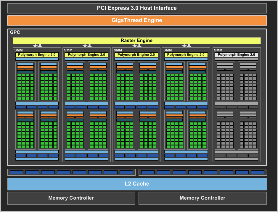 В прошлый раз мы протестировали в современных играх GTX 750 в варианте c 2 ГБ GDDR5-памяти на борту, сравнили полученные результаты с таковыми у GTX 650 и воочию наблюдали настоящий скачок производительности при смене поколений — GTX 750 почти вдвое обошла GTX 650 по показателям игровой производительности. В сегодняшнем материале, конечно же, ничего подобного ожидать не стоит, так как сравнивать мы будем архитектурно очень близкие карты — GTX 750 Ti и GTX 750 — единственная существенная разница между которыми заключается в отключении у последней одного мультипроцессора SMM, показанного на рисунке ниже серым цветом.