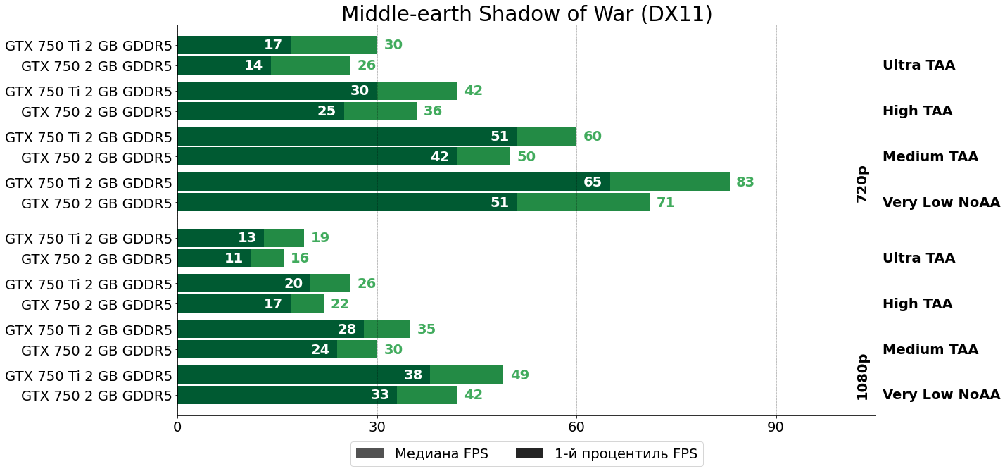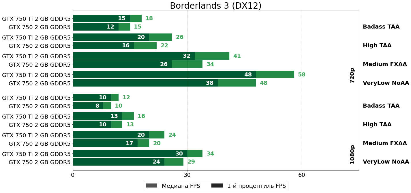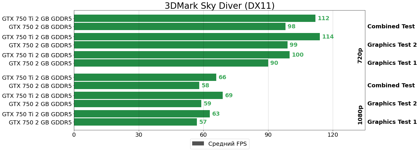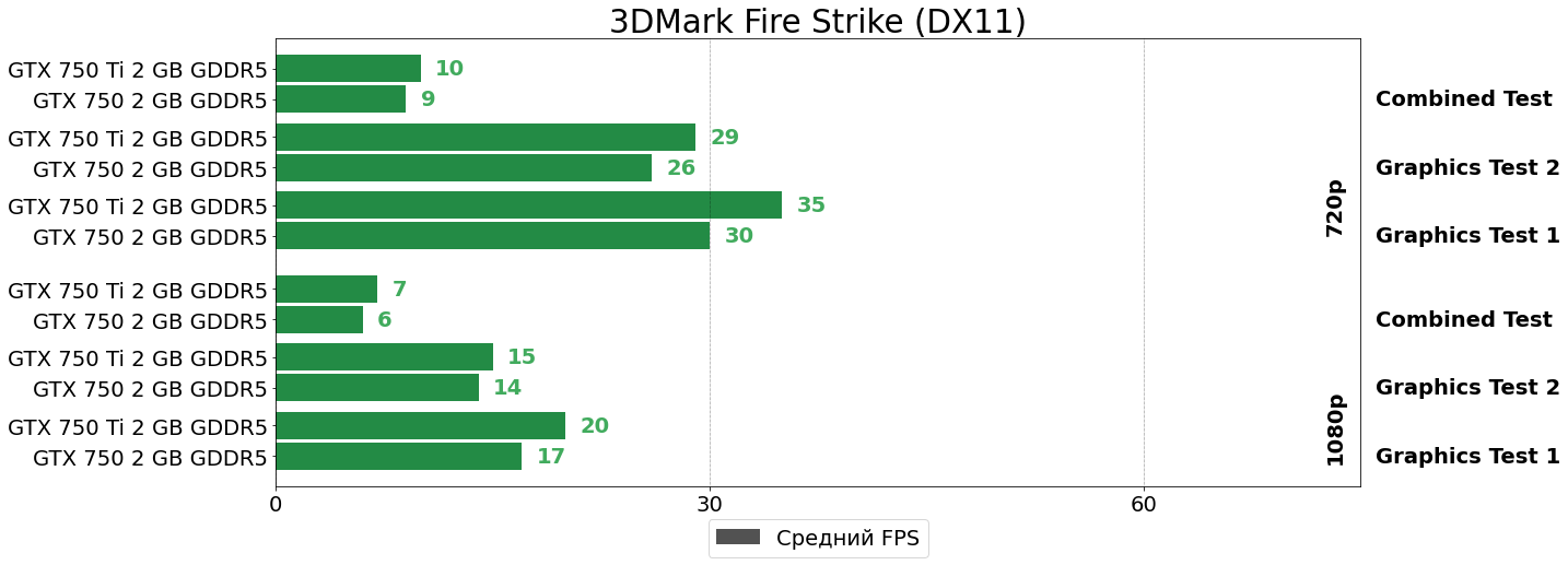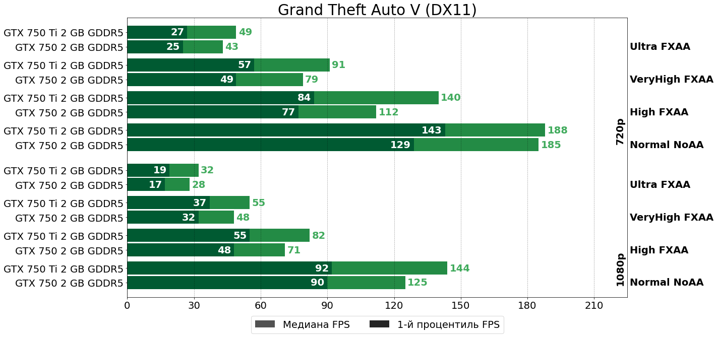 - В современных играх преимущество GTX 750 Ti над GTX 750 составляет около 20%. Конкретное значение несколько разнится от разрешения к разрешению и зависит также от настроек качества (как показано в таблице выше), но в целом отрыв GTX 750 Ti от GTX 750 в реальных играх определённо больше, чем в синтетических тестах 3DMark и значительно ближе к теоретическому пределу в 25%. Тем не менее даже отрыв в 20% не делает из GTX 750 Ti игровое решение иного уровня — всё, что играбельно на GTX 750 Ti, играбельно и на GTX 750, а всё, что неиграбельно на GTX 750, неиграбельно и на GTX 750 Ti.