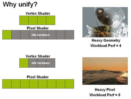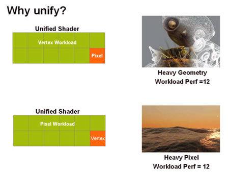 Унификация вычислительных блоков позволяет динамически распределять нагрузку между ними — на сценах со сложной геометрии можно выделить большее число блоков под выполнение вершинных шейдеров, а на сценах с простой геометрией и сложными пиксельными эффектами, наоборот, будет выгодным выделить большее число блоков под выполнение шейдеров пиксельных.