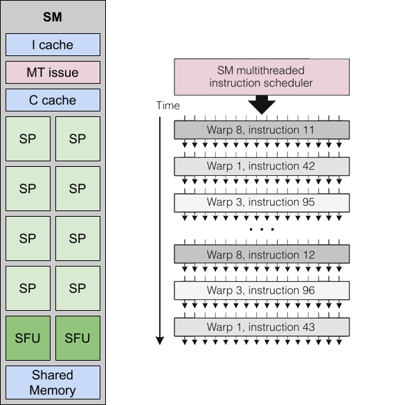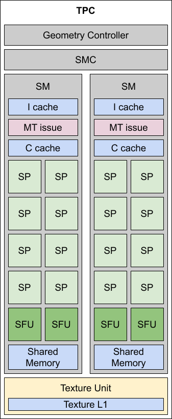 Потоковый мультипроцессор группирует 8 потоковых процессоров, 2 более сложных устройства для вычисления значений трансцендентных функций (cosx, sinx, ex) и интерполяции пиксельных атрибутов (Special-Function Unit, SFU), устройство выборки и отправки на выполнения инструкций (MT Issue), немного кэша инструкций и констант (I/C cache), а также небольшой блок общей памяти (Shared Memory). Каждое устройство SFU способно интерполировать 1 пиксельный атрибут или вычислять значения специальной функции за 1 такт.