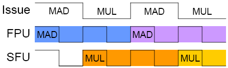 Тогда в случае, если требуется выполнять лишь инструкции MAD и MUL появляется интересная возможность выполнять 32 инструкции MAD за 4 такта на SP-устройствах и ещё 32 инструкции MUL на SFU-устройствах в рамках одного и того потокового мультипроцессора, используя вышеупомянутые особенности планировщика (поочерёдное планирование выполнения инструкций на SP- и SFU-устройствах и работу на вдвое более низкой частоте).