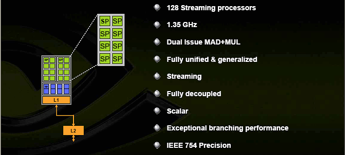 При рассмотрении архитектуры графических процессоров необходимо в первую очередь понимать, что многие привычные термины, используемые при описании архитектуры центральных процессоров, обретают здесь несколько иной смысл. Так, под потоком здесь и далее понимается вершина, пиксель или геометрический примитив (полигон), над которым необходимо выполнить соответствующую шейдерную программу, состоящую из некоторой последовательности инструкций. В чипе G80, основанном на микроархитектуре Tesla, простейшей единицей выполнения инструкций над потоком является потоковый процессор (Streaming Processor, SP), представляющий собой по сути скалярное устройство для вычислений над числами с плавающей точкой одинарной точности (FP32). Это единственное скалярное АЛУ способно посредством совмещённого умножения-сложения (MAD) выполнять сразу две операции за такт — одно сложение (ADD) и одно умножение (MUL). Кроме того, в целях реализации требований API Direct3D 10 указанное АЛУ способно также выполнять операции и над целыми числами.