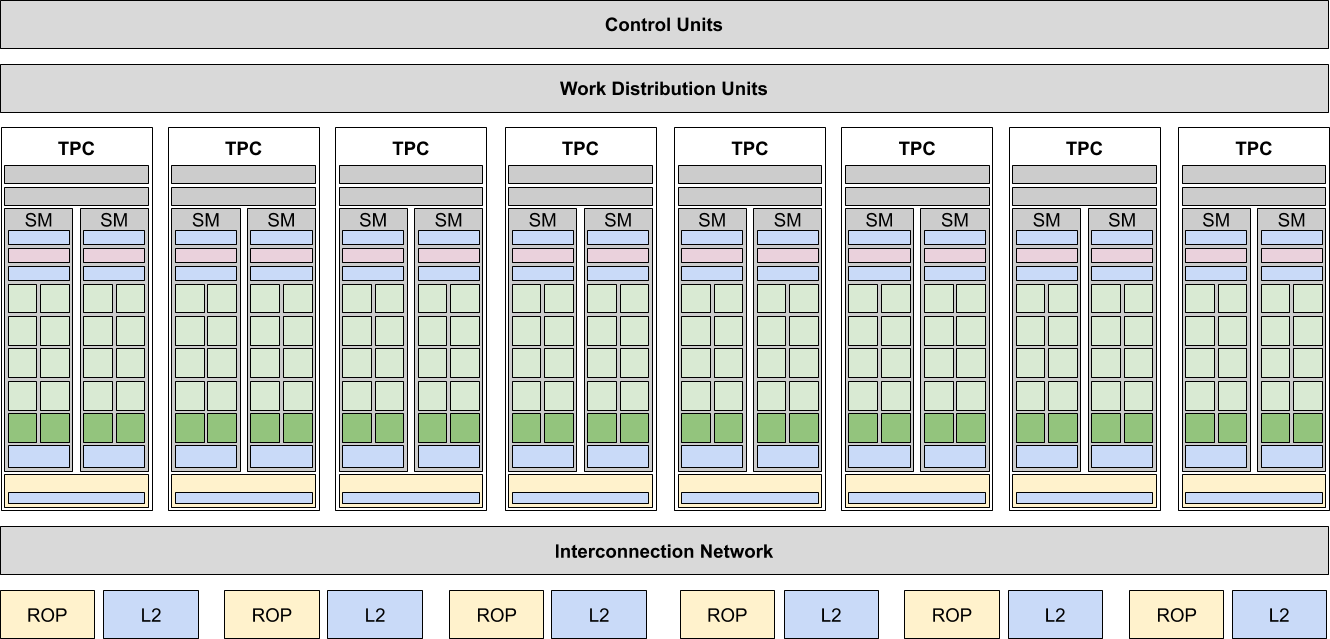 Помимо собственного L1-кэша у кластеров TPC имелся также доступ к L2-кэшу и регистрам общего назначения, что было сделано для обеспечения упомянутой в начале статьи потоковой обработки данных — данные, обработанные всяким кластером TPC при выполнении определённого шейдера выгружались в общий кэш, откуда могли быть вычитаны другим кластером TPC и обработаны во время выполнения другого шейдера. Таким образом, итоговая диаграмма чипа G80 получается примерно такой, как показано ниже.