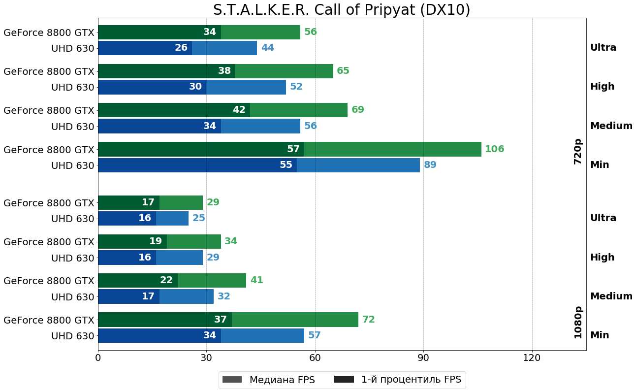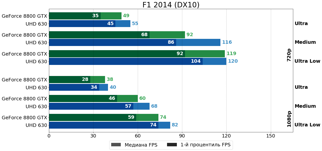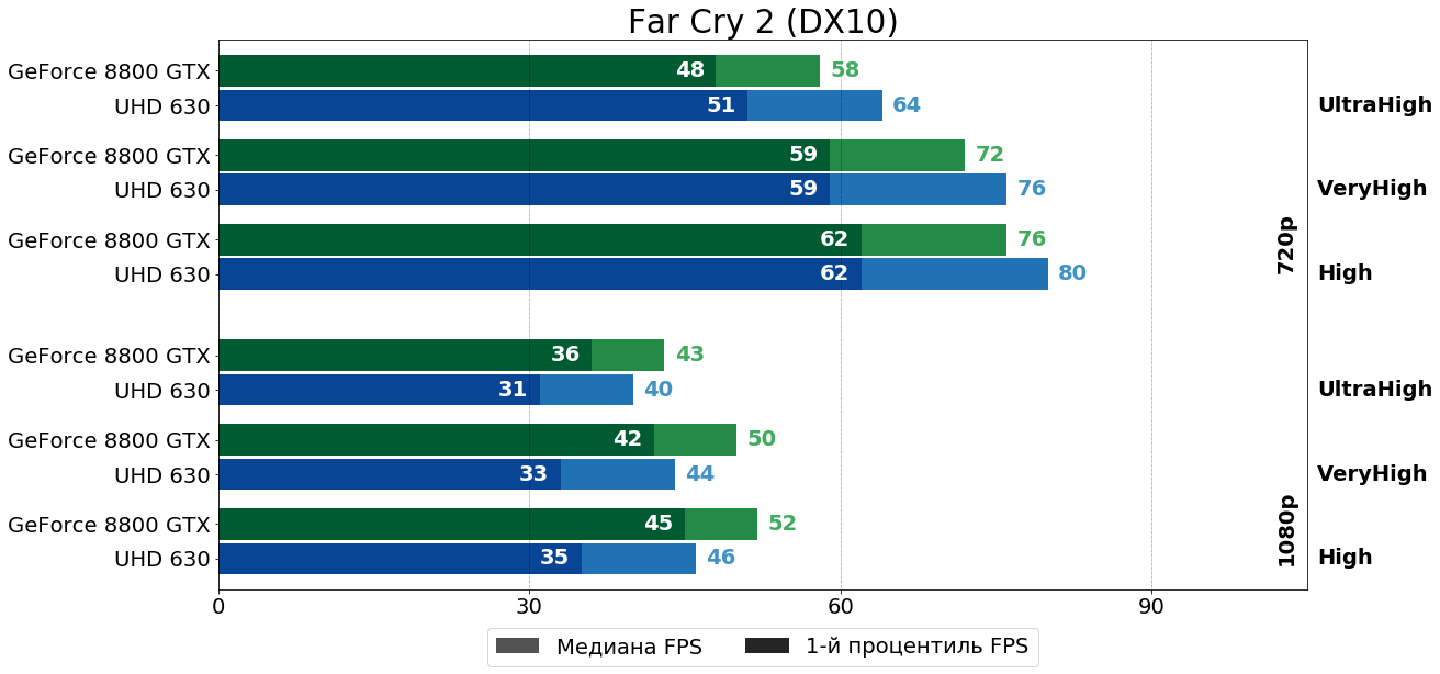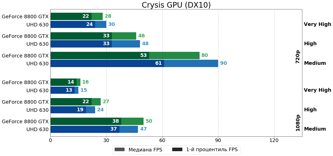 Сколько игр не тестируй, а на вопрос But can it run Crysis? ответить ты обязан. Конечно, в отличие от Call of Juarez, Crysis, как и многие другие игры тех лет, не сильно отличался по уровню картинки в режиме DirectX 10, но в отличие от многих других игр дело обстояло так только потому, что выглядел Crysis просто потрясающе и при использовании "старого" DirectX 9 API. Правда, минимальные настройки было решено отбросить, так как их вышесказанное не касалось — на минимальных настройках игра ни разу не выглядела как технологический шедевр. Да и FPS на нормальных картах в таком режиме "зашкаливал", так что начинаем со средних настроек и видим, что в HD-разрешении небольшая победа за UHD 630, а в FHD вперёд немного вырывается уже 8800 GTX.