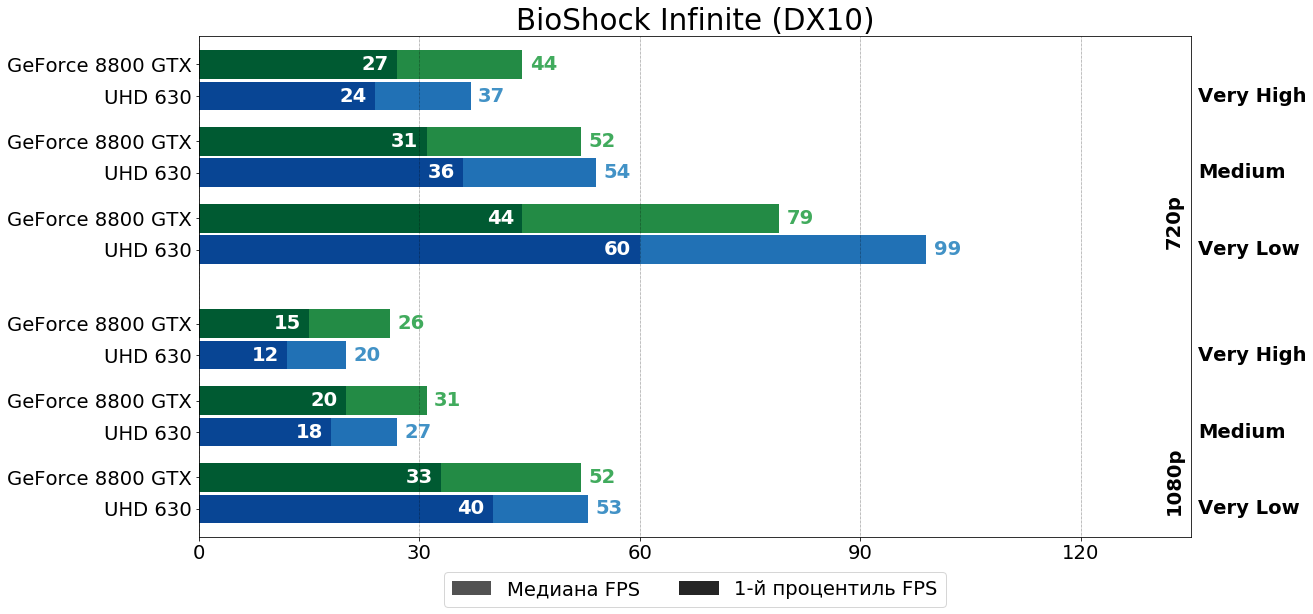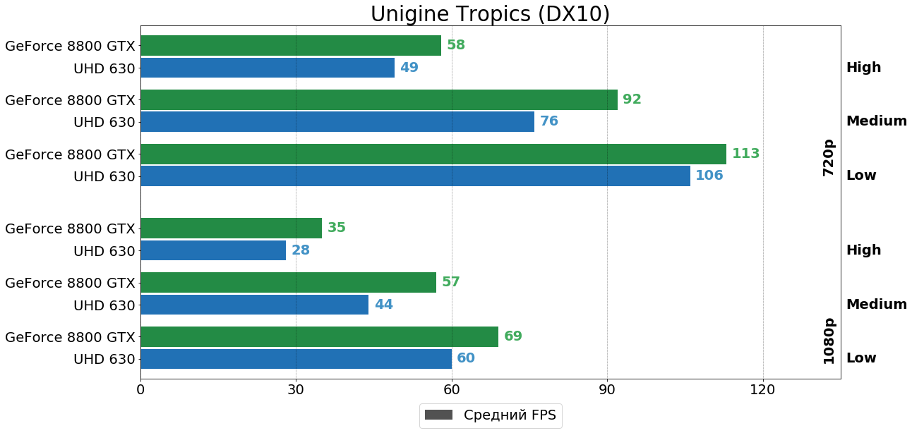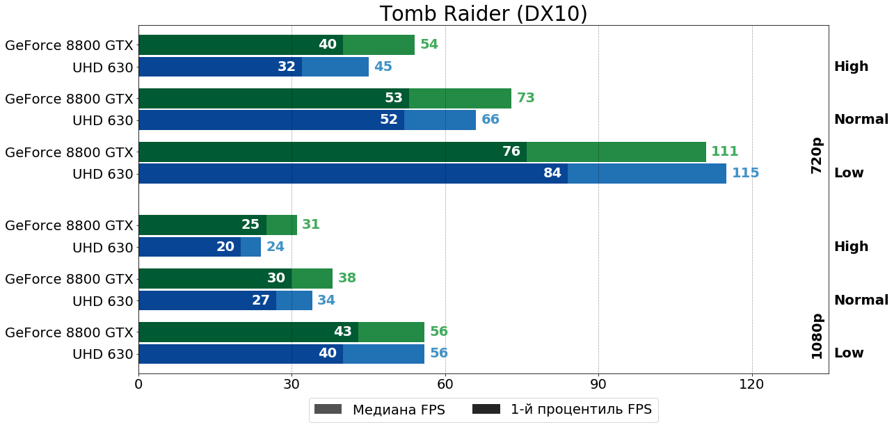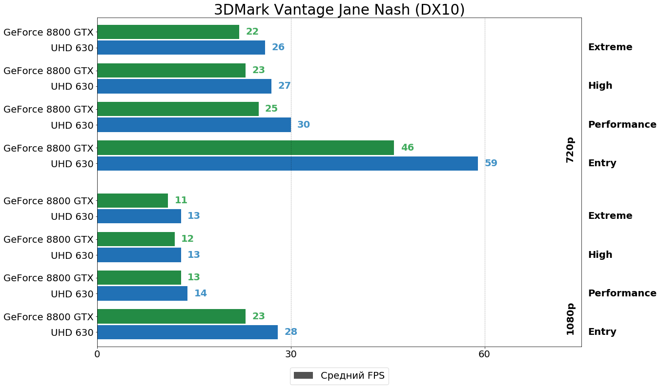 Сколько игр не тестируй, а на вопрос But can it run Crysis? ответить ты обязан. Конечно, в отличие от Call of Juarez, Crysis, как и многие другие игры тех лет, не сильно отличался по уровню картинки в режиме DirectX 10, но в отличие от многих других игр дело обстояло так только потому, что выглядел Crysis просто потрясающе и при использовании "старого" DirectX 9 API. Правда, минимальные настройки было решено отбросить, так как их вышесказанное не касалось — на минимальных настройках игра ни разу не выглядела как технологический шедевр. Да и FPS на нормальных картах в таком режиме "зашкаливал", так что начинаем со средних настроек и видим, что в HD-разрешении небольшая победа за UHD 630, а в FHD вперёд немного вырывается уже 8800 GTX.