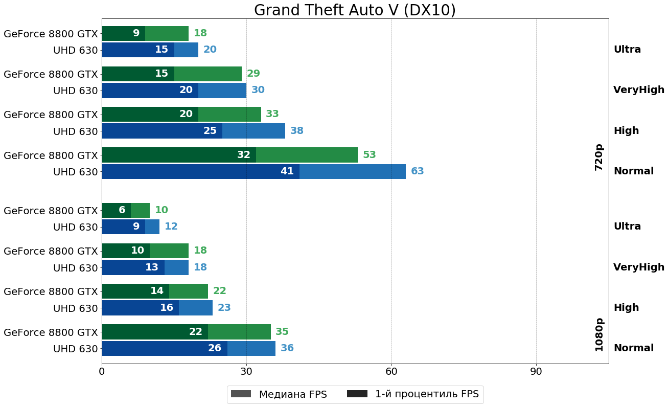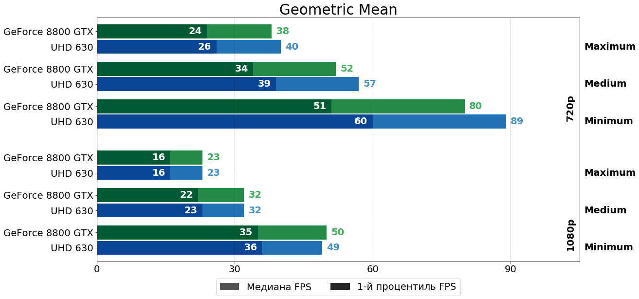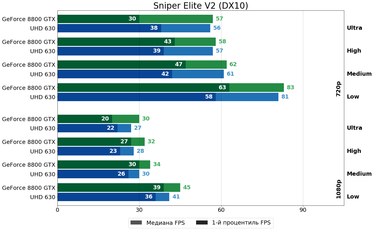 Не дать проклятым нацистам довести до ума ракетную программу и запустить ракету на Лондон одинаково хорошо получится и на UHD 630, и на 8800 GTX. В FHD незначительно преимущество за "старичком", но в целом +/- ровно.