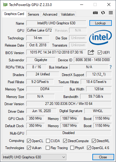 - Технические характеристики UHD 630, приведённые в таблице и взятые из вывода утилиты GPU-Z, кажутся похожими на правду — как и ожидалось, "встройка" быстрее "считает", но испытывает проблемы на высоких настройках графики и в высоких же разрешениях из-за малого количества TMU и ROP.